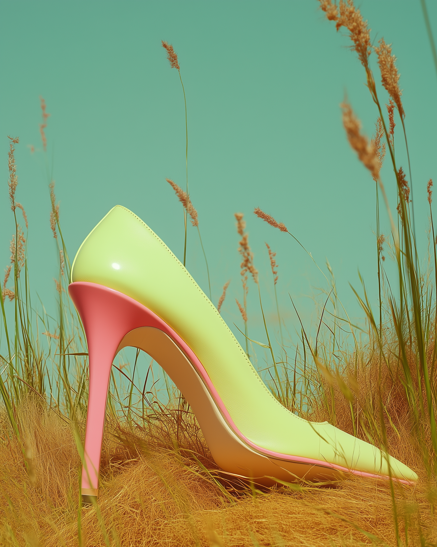 Stylish pastel high heel in a natural setting with lime green and pink hues, surrounded by tall grasses under a turquoise sky.