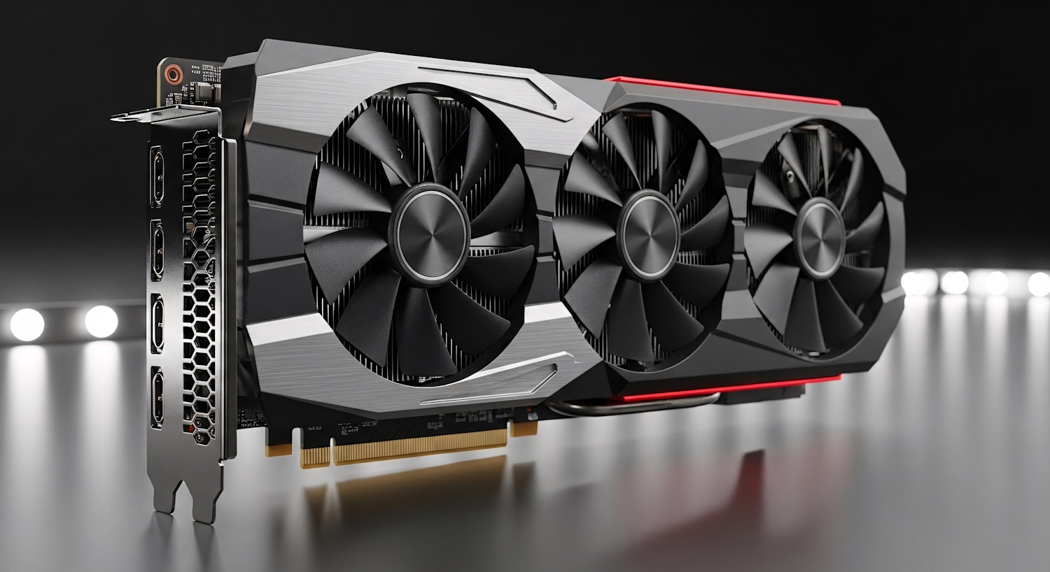 High-performance graphics card with triple fans, sleek metallic design, and multiple HDMI/DisplayPort outputs for gaming or professional use.