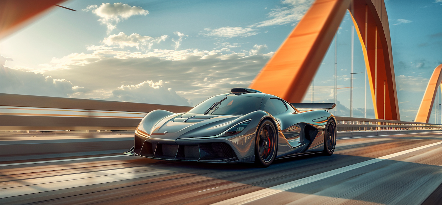 Futuristic silver sports car racing on a bridge with striking orange arches under a bright sky, showcasing speed and modern design.