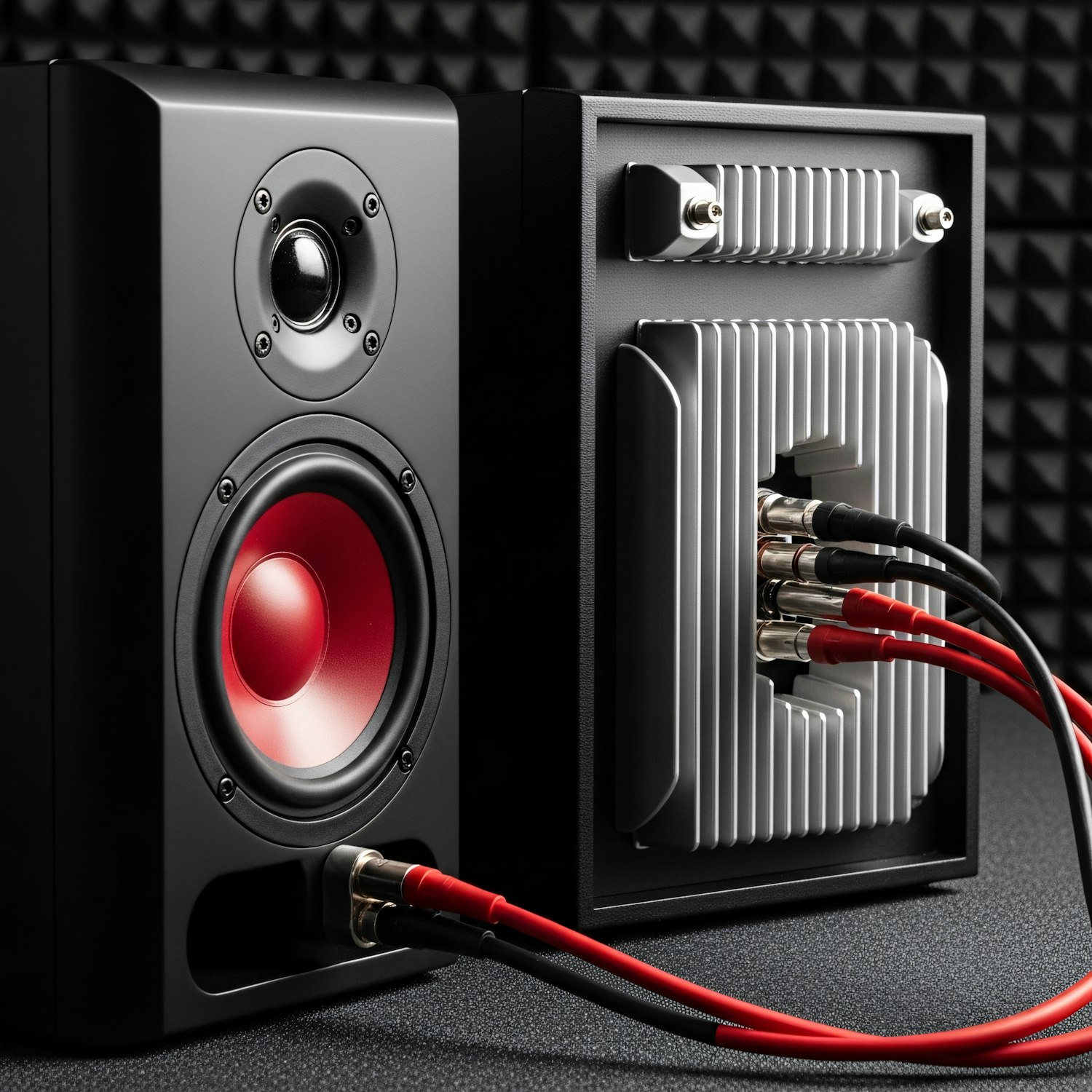 Close-up of a modern speaker system with a red woofer, metallic heat sink, and connected audio cables in a soundproofed environment.