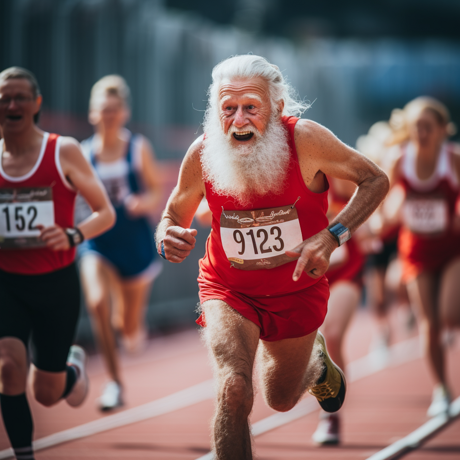 Elderly man with white beard in red running gear, energetically racing on a track, surrounded by other runners. Race number 9123.