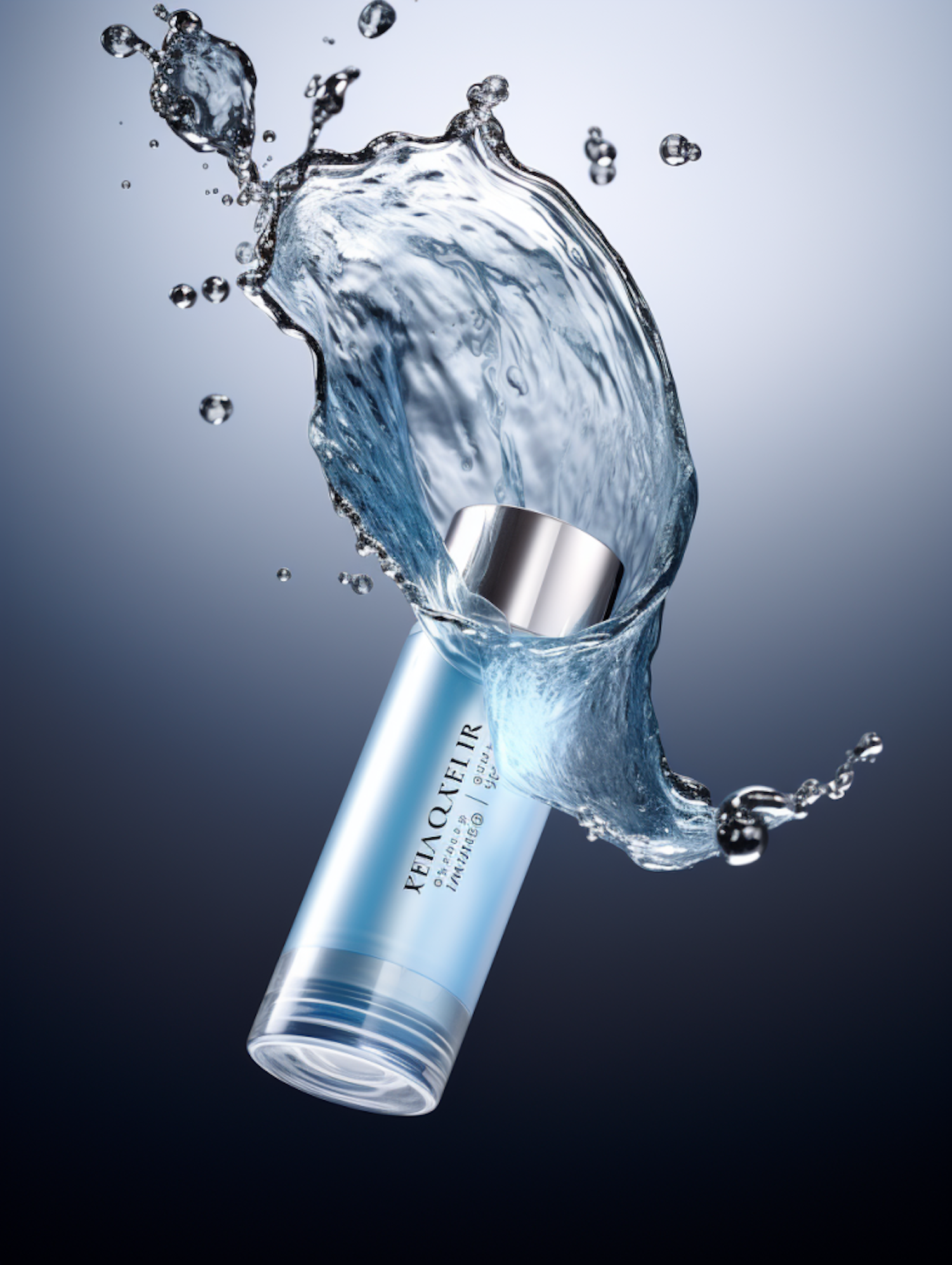 Dynamic splash of water surrounds a sleek blue bottle, creating a fresh and energetic visual with a modern aesthetic.