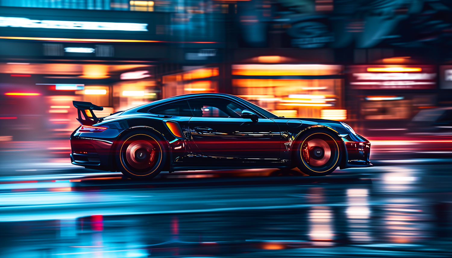 Sleek black sports car racing through a neon-lit city street at night, capturing speed and energy with vibrant motion blur.
