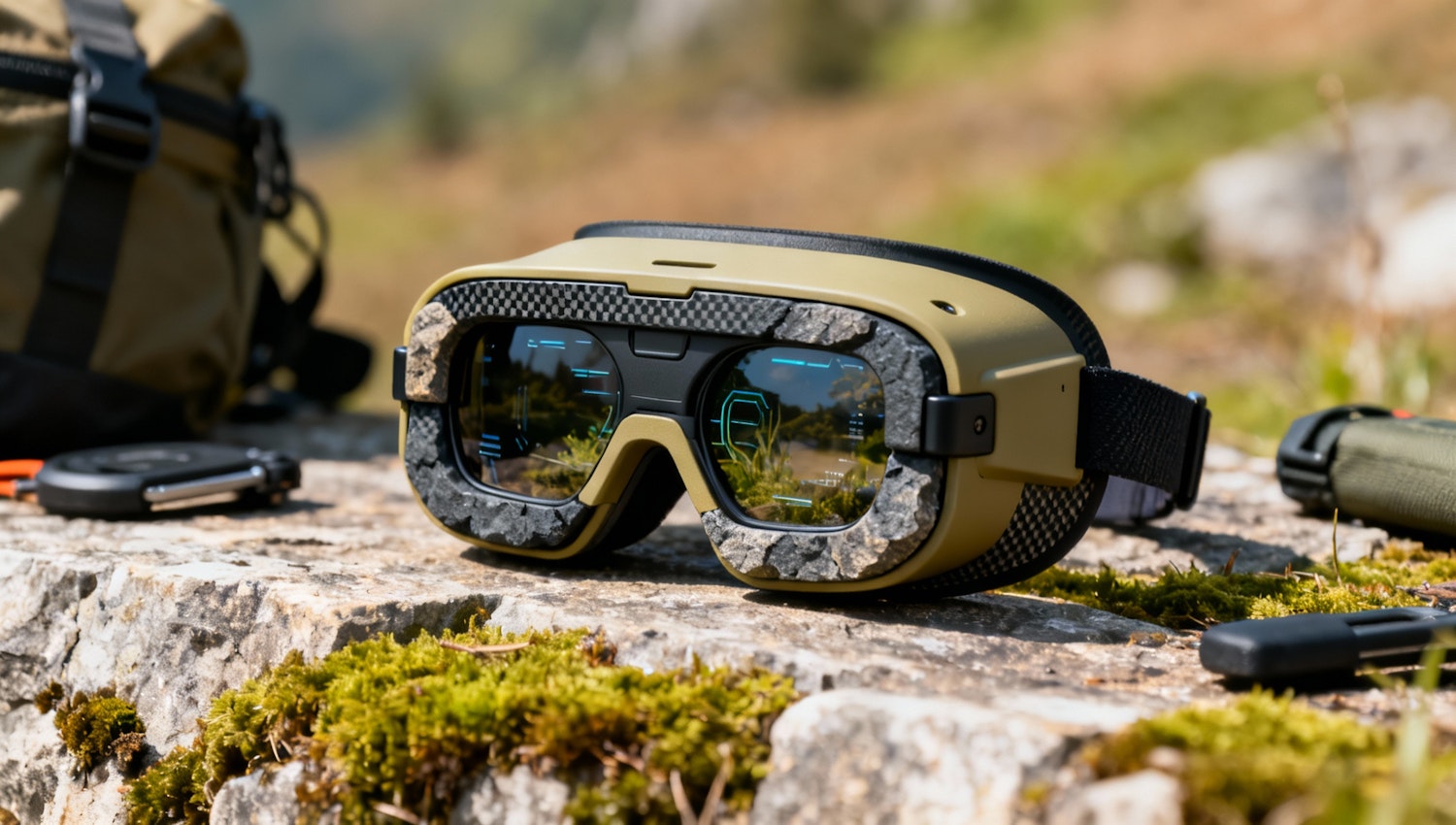 High-tech goggles with a rugged design and digital display, set outdoors on a mossy stone with adventure gear in the background.