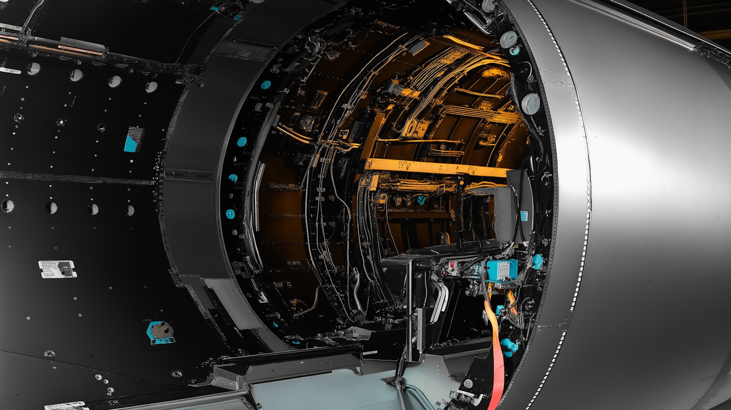 A detailed view of a high-tech aircraft or spacecraft fuselage interior, featuring intricate wiring, tubing, and structural components.