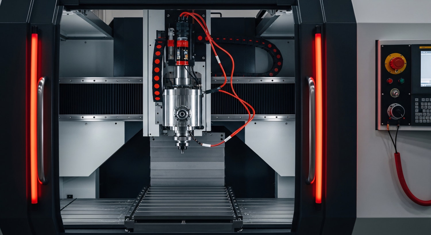 Modern CNC machine with red accents, precision spindle, and advanced control panel, perfect for high-precision manufacturing.
