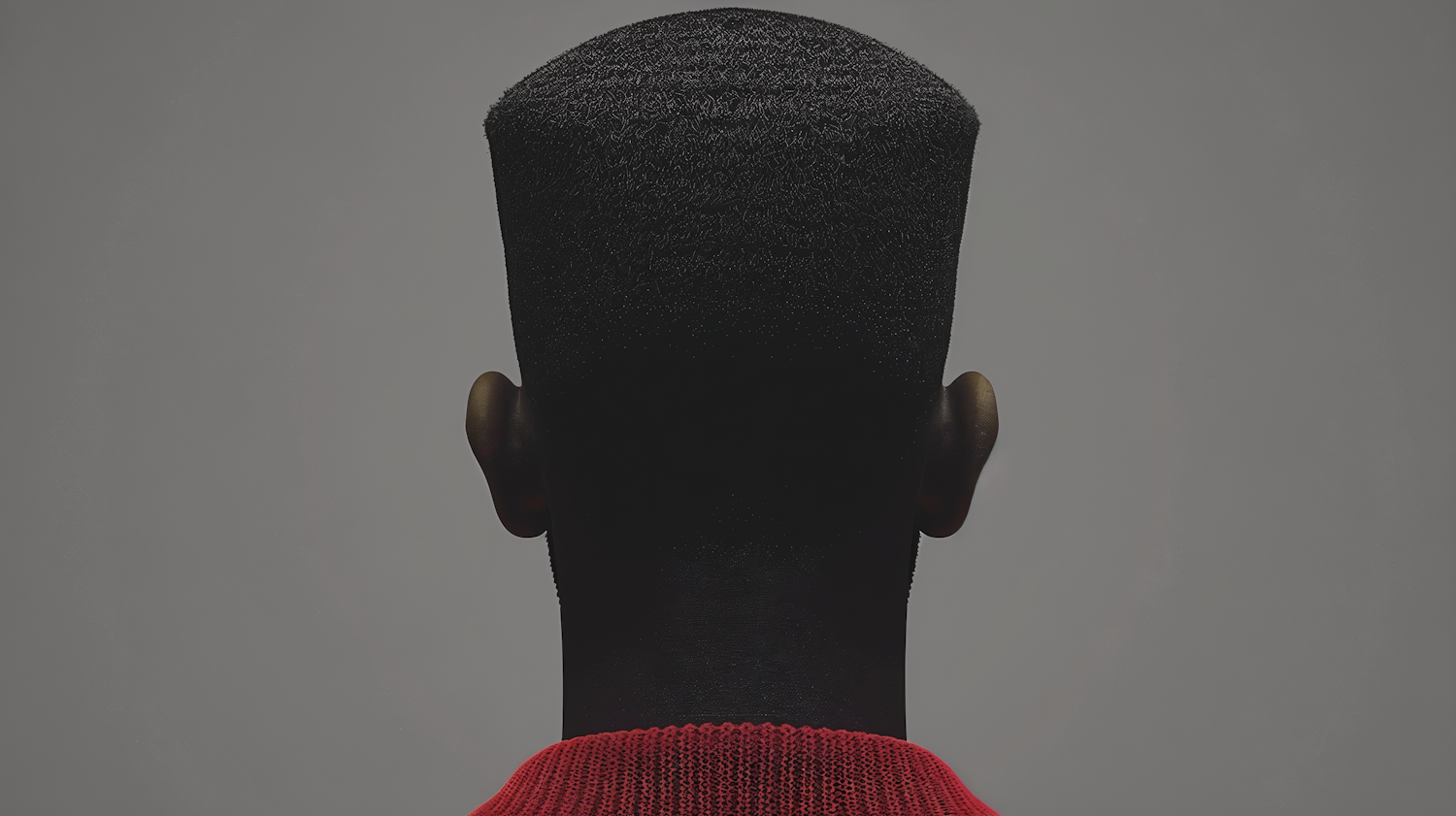 Back view of a person with a high-top fade hairstyle and red sweater against a gray background.