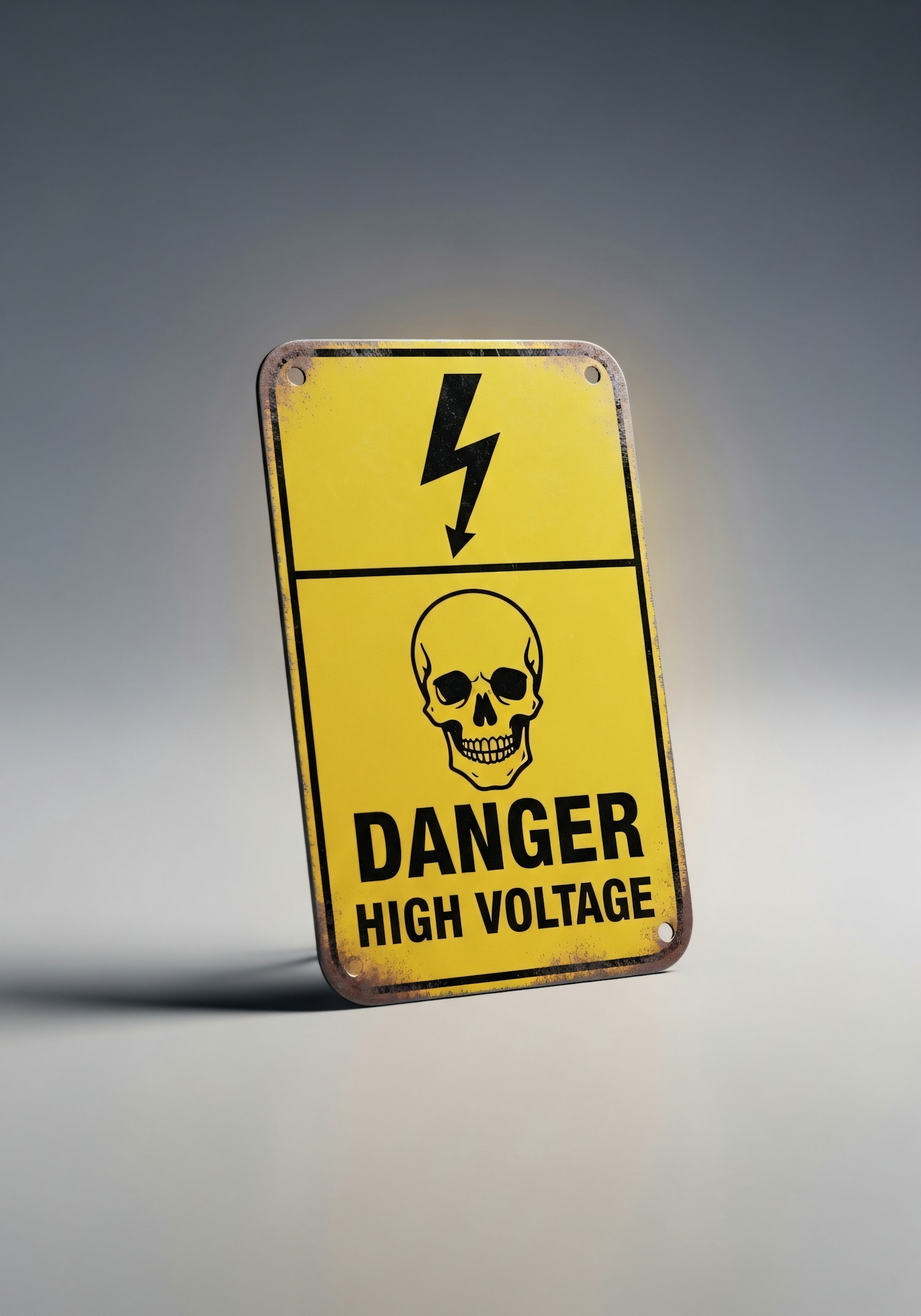 Yellow warning sign with a skull and lightning bolt, labeled 'Danger High Voltage,' on a neutral background.