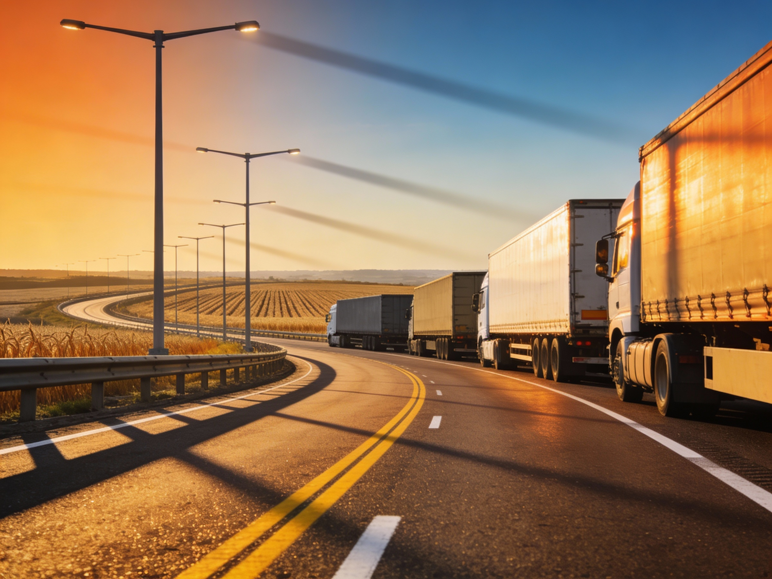 A line of trucks on a highway at sunset, with a scenic backdrop of fields and a vibrant sky transitioning from orange to blue.