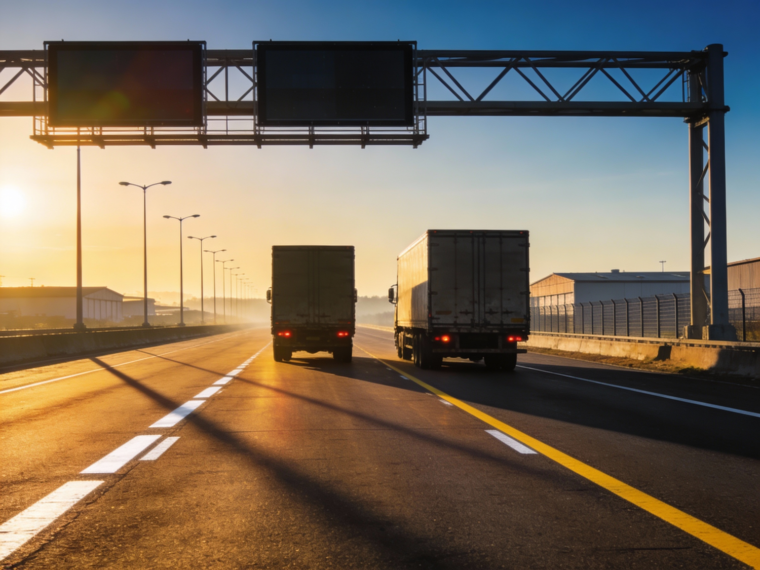 Early morning logistics highway scene in clear weather, low sun casting long, dramatic shadows across a dry multi-lane road; twin cargo trucks driving away from camera in adjacent lanes, taillights faint; crisp white and yellow markings catching warm light; overhead gantry with electronic sign frames (content unreadable) and lampposts receding; distant warehouses and sound barriers softened by light atmospheric depth, sky a gradient from warm horizon to deep blue. 24 mm, f/7.1, ISO 100, 1/250 s; CPL for sky depth and controlled asphalt glare — moderate rotation only. Negative: gray haze, over-clarity on vehicles, halo on gantries, metallic color shifts.