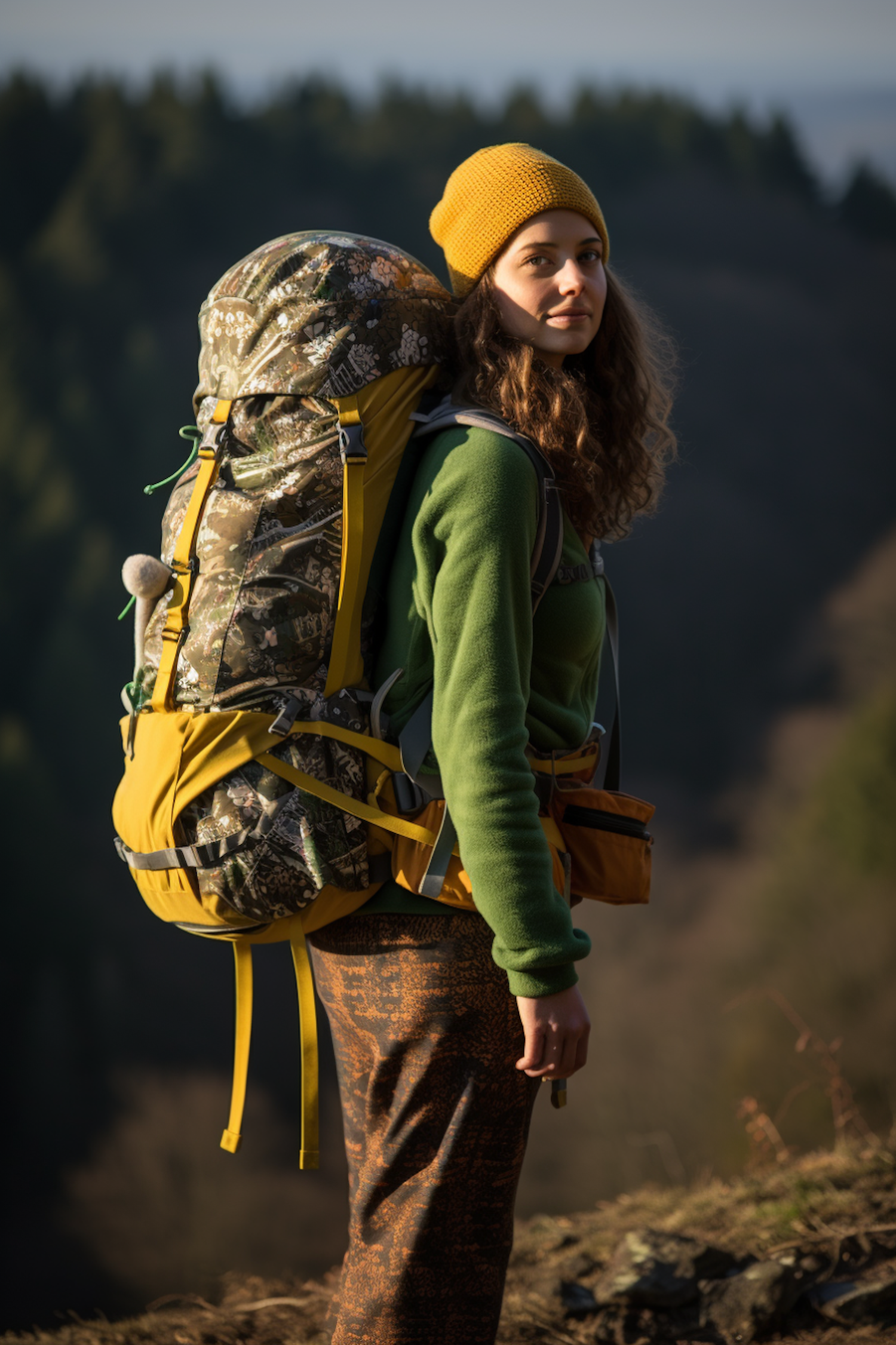 Young woman with a backpack in nature, wearing a yellow beanie and green jacket, standing on a hillside with a forest backdrop.