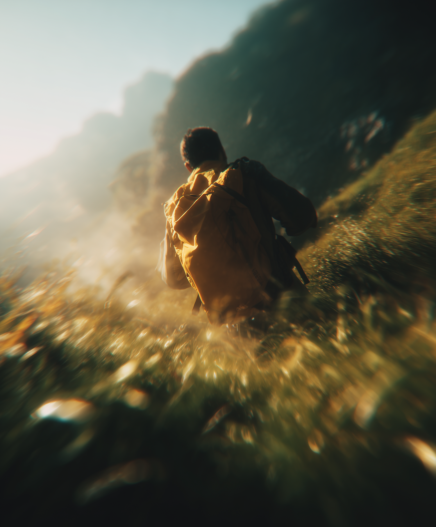 A hiker with a yellow backpack walks through a sunlit grassy field, surrounded by mist and mountains in the distance.