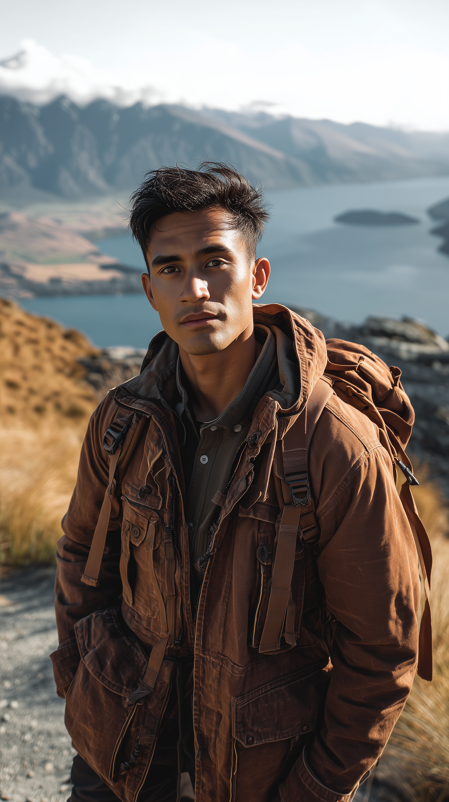A young man in a rugged brown jacket and backpack stands in a stunning mountain landscape with a lake and hills in the background.
