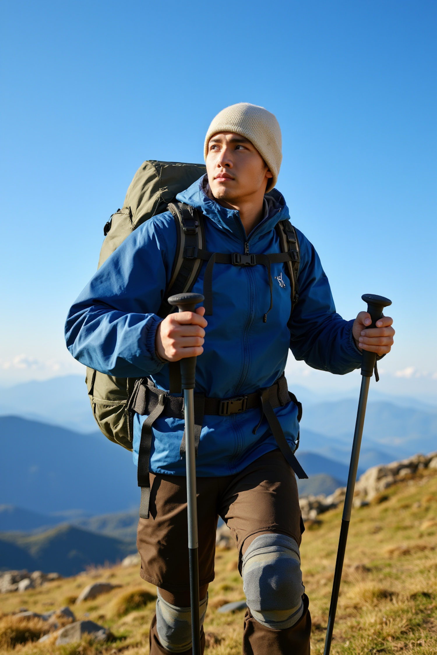 A hiker in a blue jacket and beige beanie trekking through scenic mountains on a sunny day, carrying a backpack and using trekking poles.