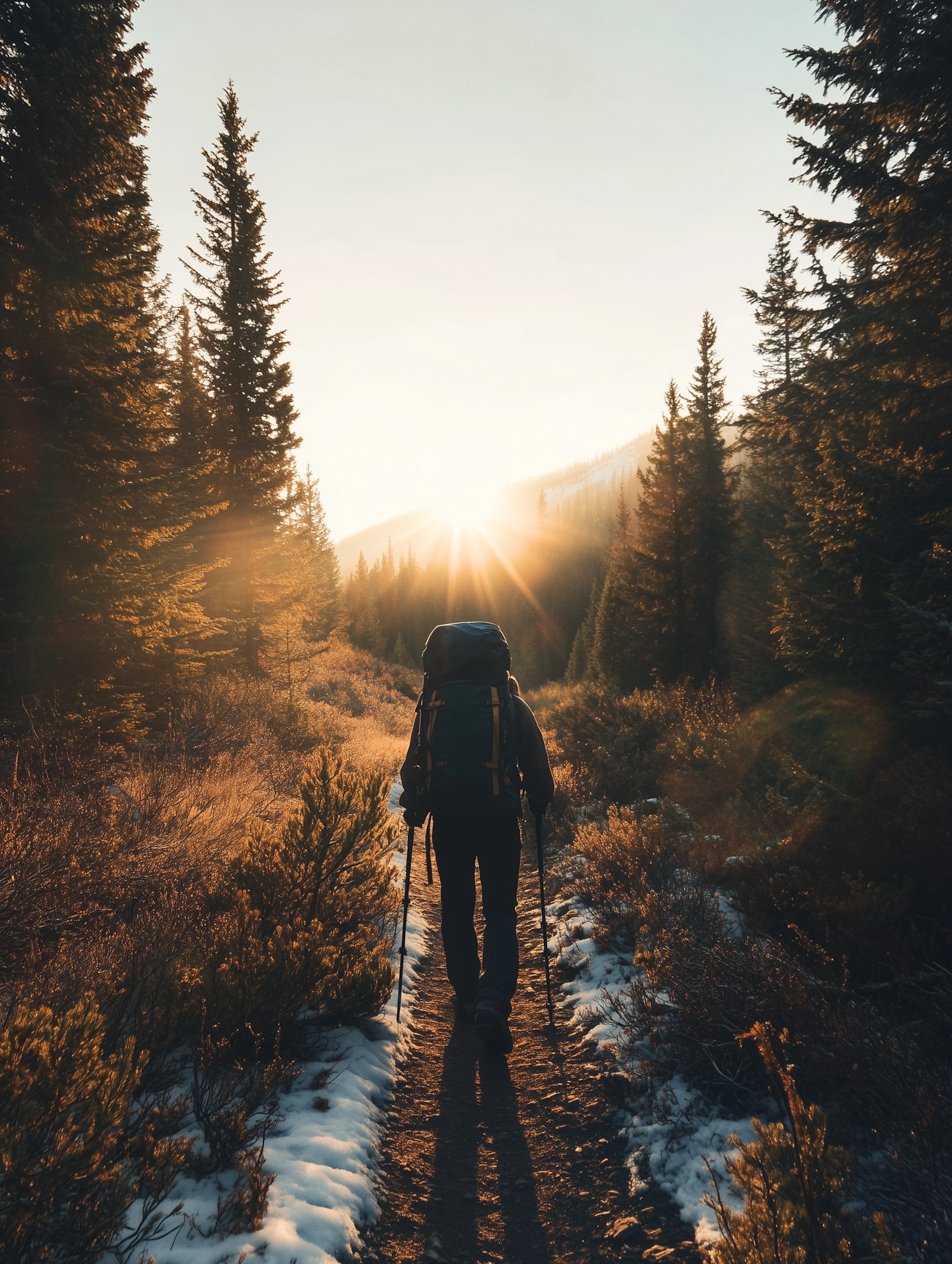 A hiker with trekking poles walks through a snowy forest trail at sunrise, surrounded by golden light and tall evergreens.