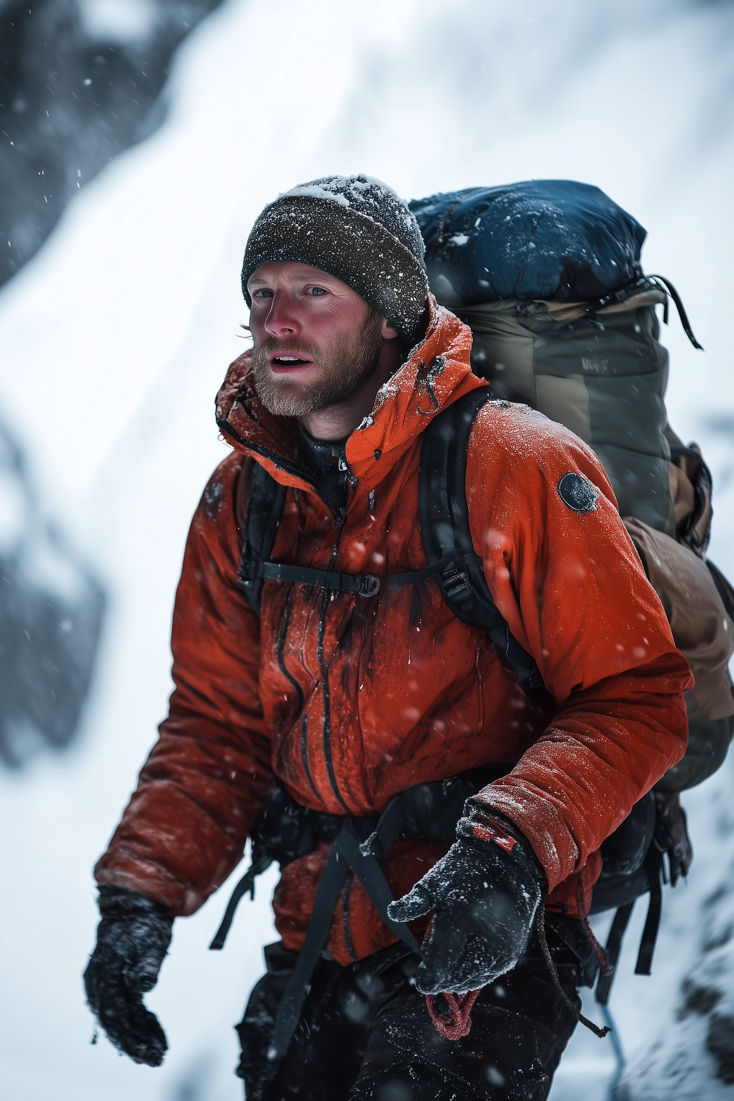 A rugged hiker in an orange jacket treks through snowy terrain, carrying a large backpack. Snowflakes dot his clothing.
