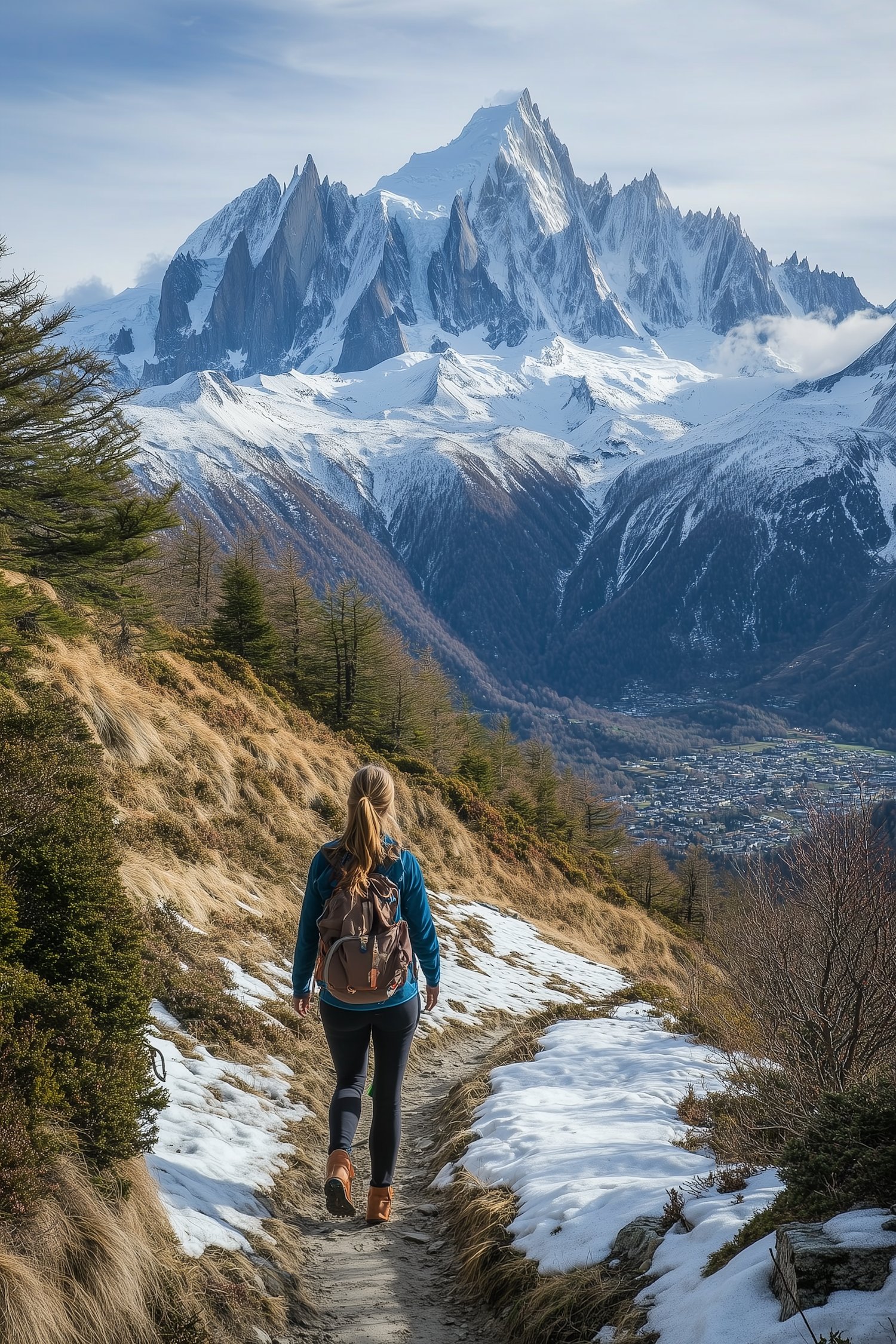 Woman hiking on a snowy mountain trail with stunning peaks in the background, capturing adventure and natural beauty.