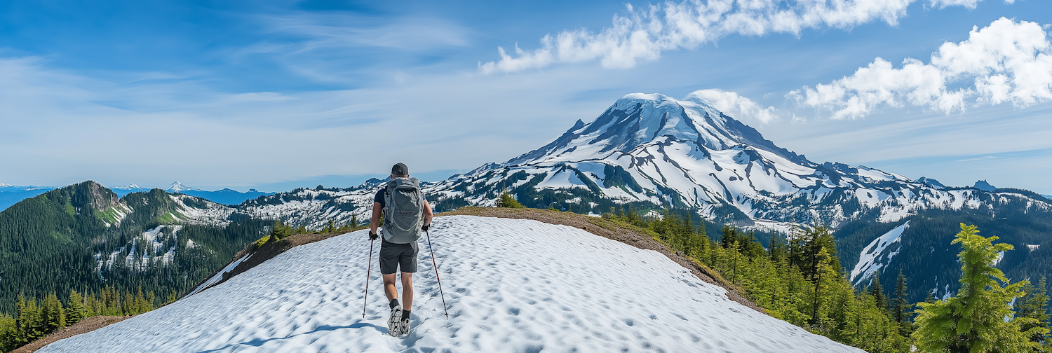 A hiker explores a snowy trail with a stunning view of a snow-capped mountain and lush green forests under a vibrant blue sky.