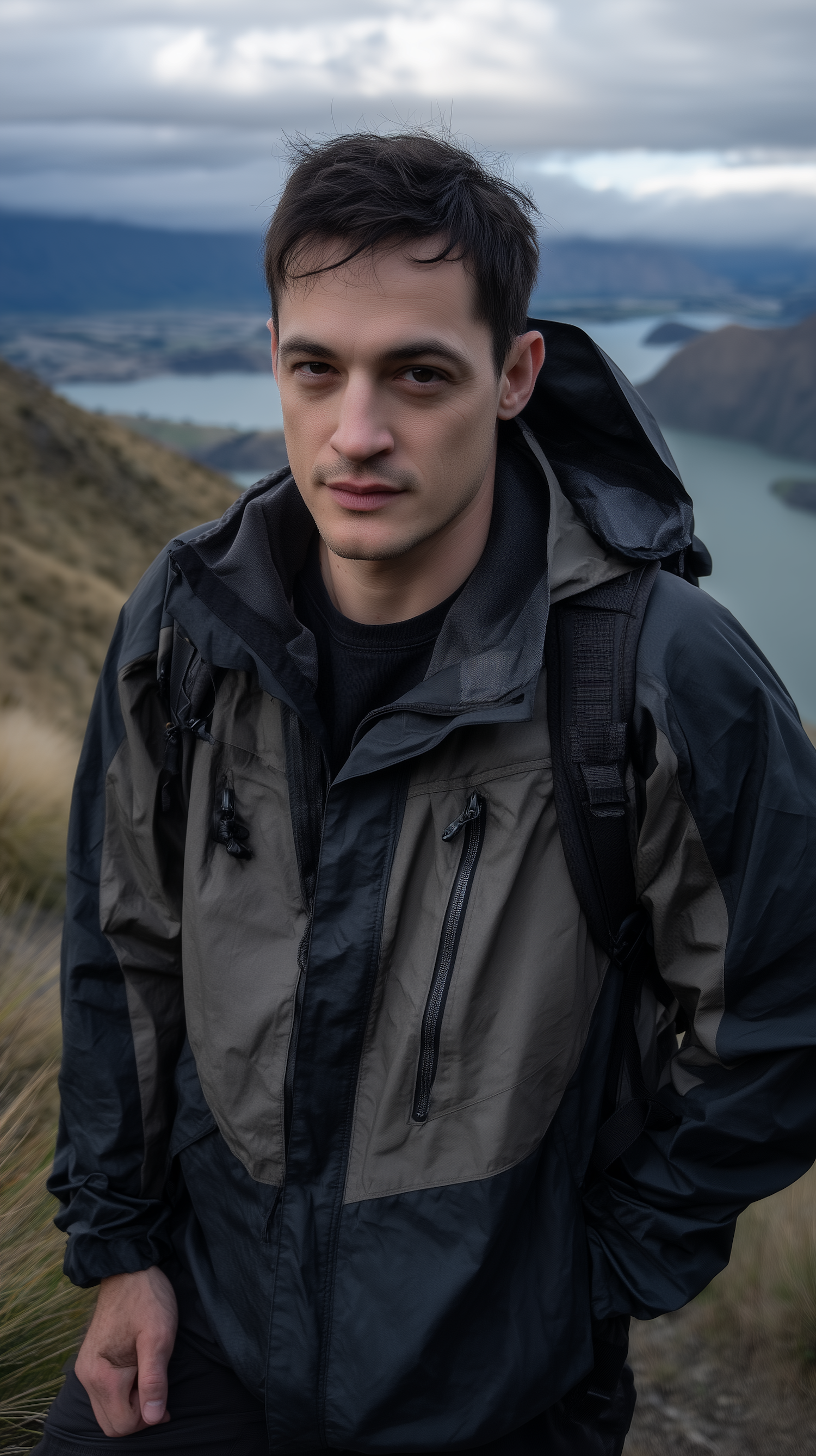 Man in a black and gray outdoor jacket hiking on a hillside with a scenic lake and mountain view in the background.