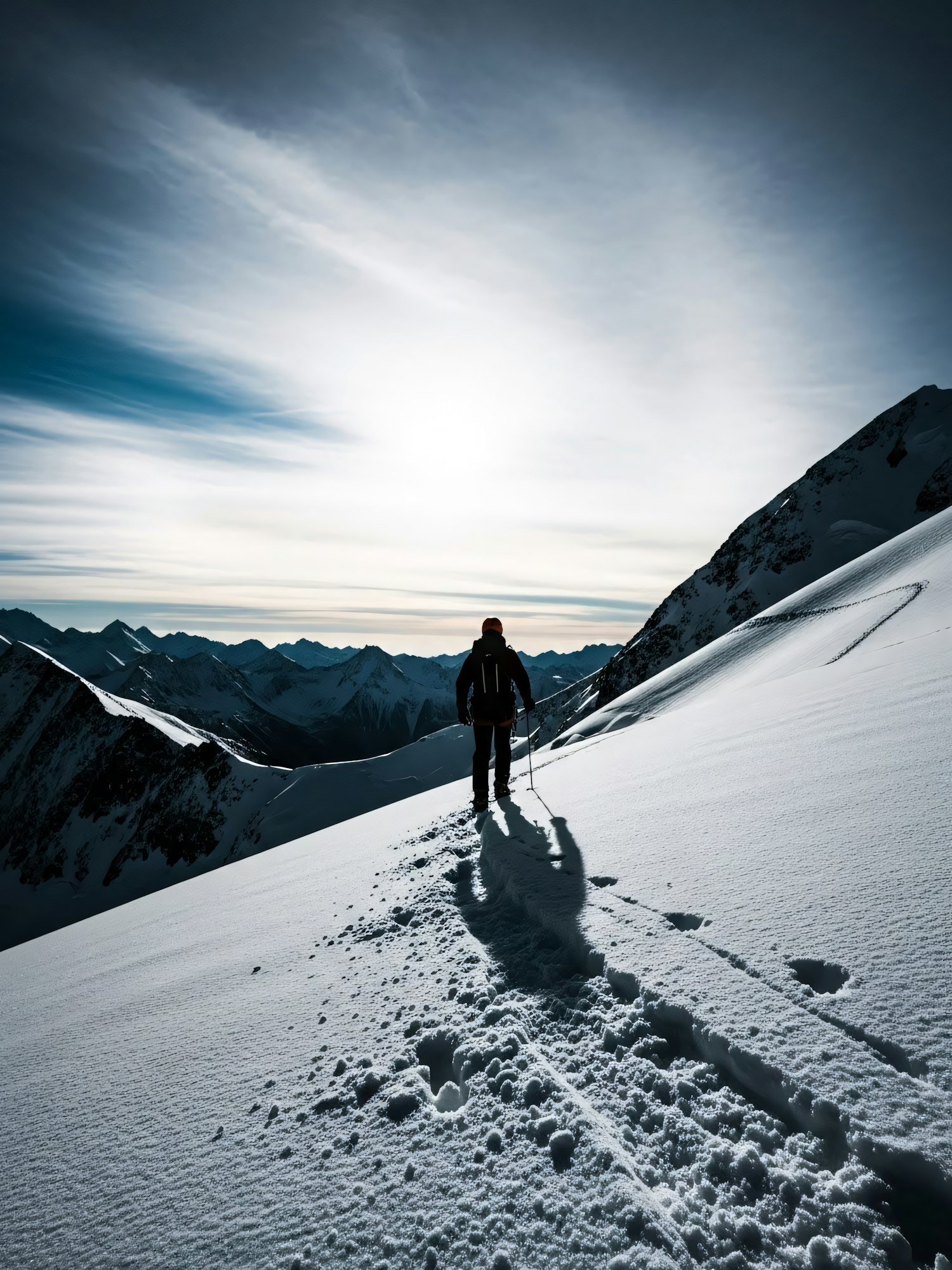 A lone hiker ascends a snowy mountain slope under a dramatic sky, surrounded by rugged peaks and pristine snow. A scene of adventure.