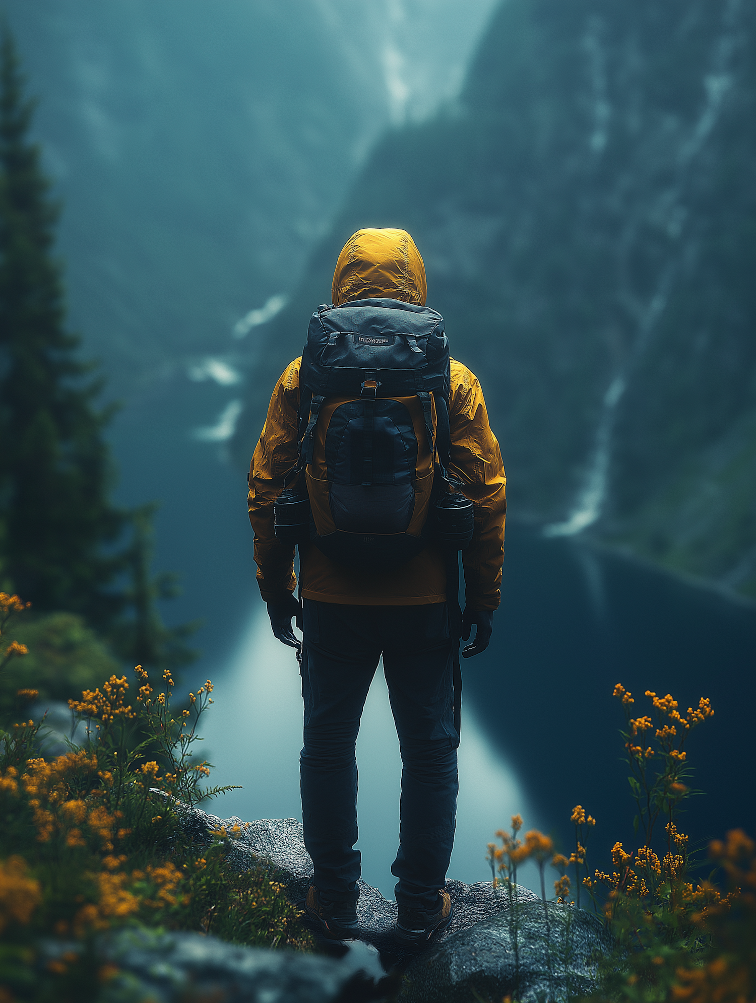 Adventurer in yellow jacket stands on a misty ledge, overlooking a foggy valley with wildflowers in the foreground.