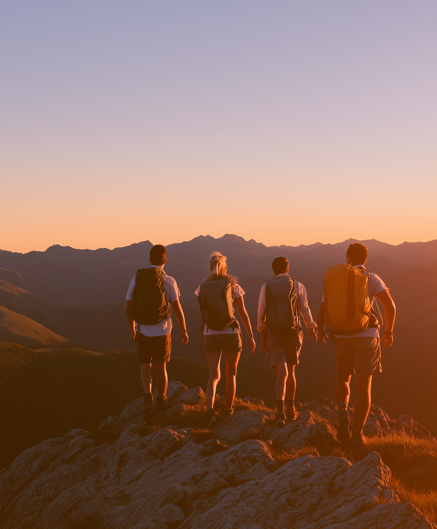 Four hikers silhouetted against a sunset on a mountain peak, with backpacks and a stunning view of distant ranges.