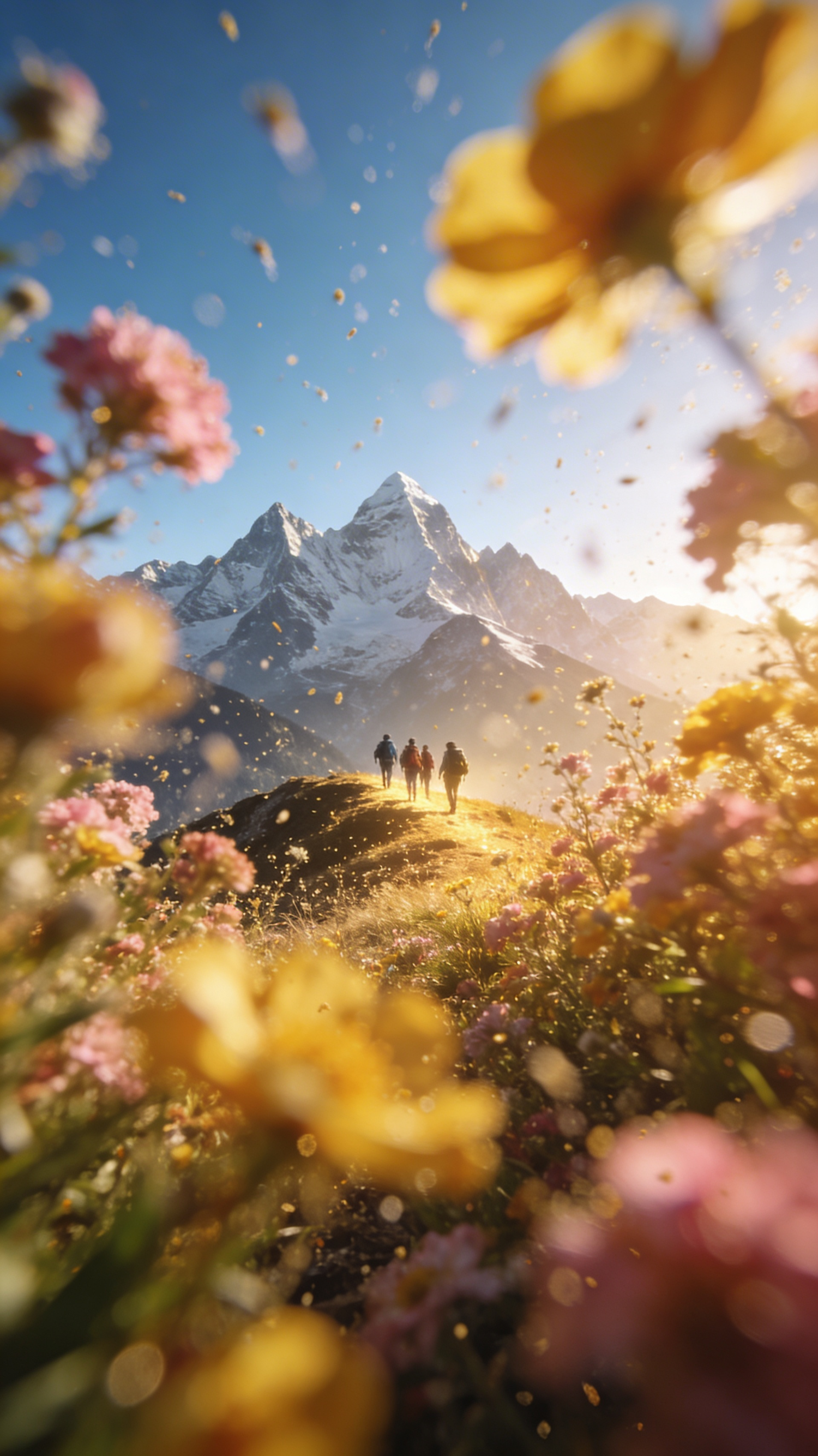 A cinematic low-angle shot, captured through dense flower bushes with extremely strong foreground blurring. A small group of hikers walks along a distant mountain ridge in the center background beneath a clear blue sky, lit by warm golden sunlight. Yellow and pink petals and fine pollen particles drift through the air. Majestic snow-capped mountains appear in the distance. Shot with a 35mm lens, aperture f/1.4, ultra-realistic, photo-realistic, dreamy travel atmosphere, rich detail, high dynamic range, 8k resolution.