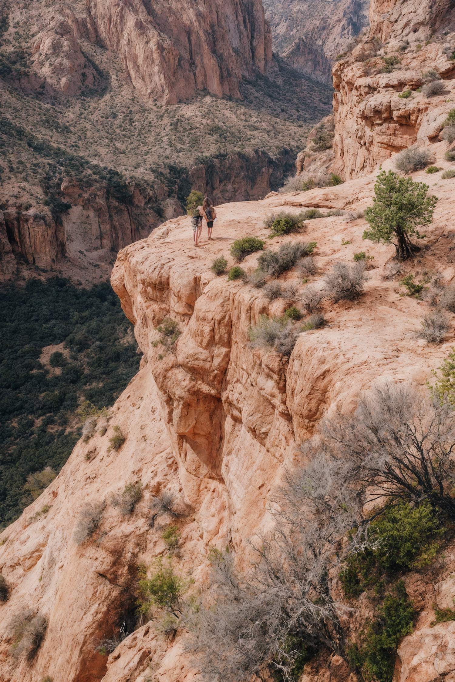 Two hikers stand on a rocky cliff edge, overlooking a vast canyon with rugged terrain and sparse vegetation. A breathtaking adventure scene.