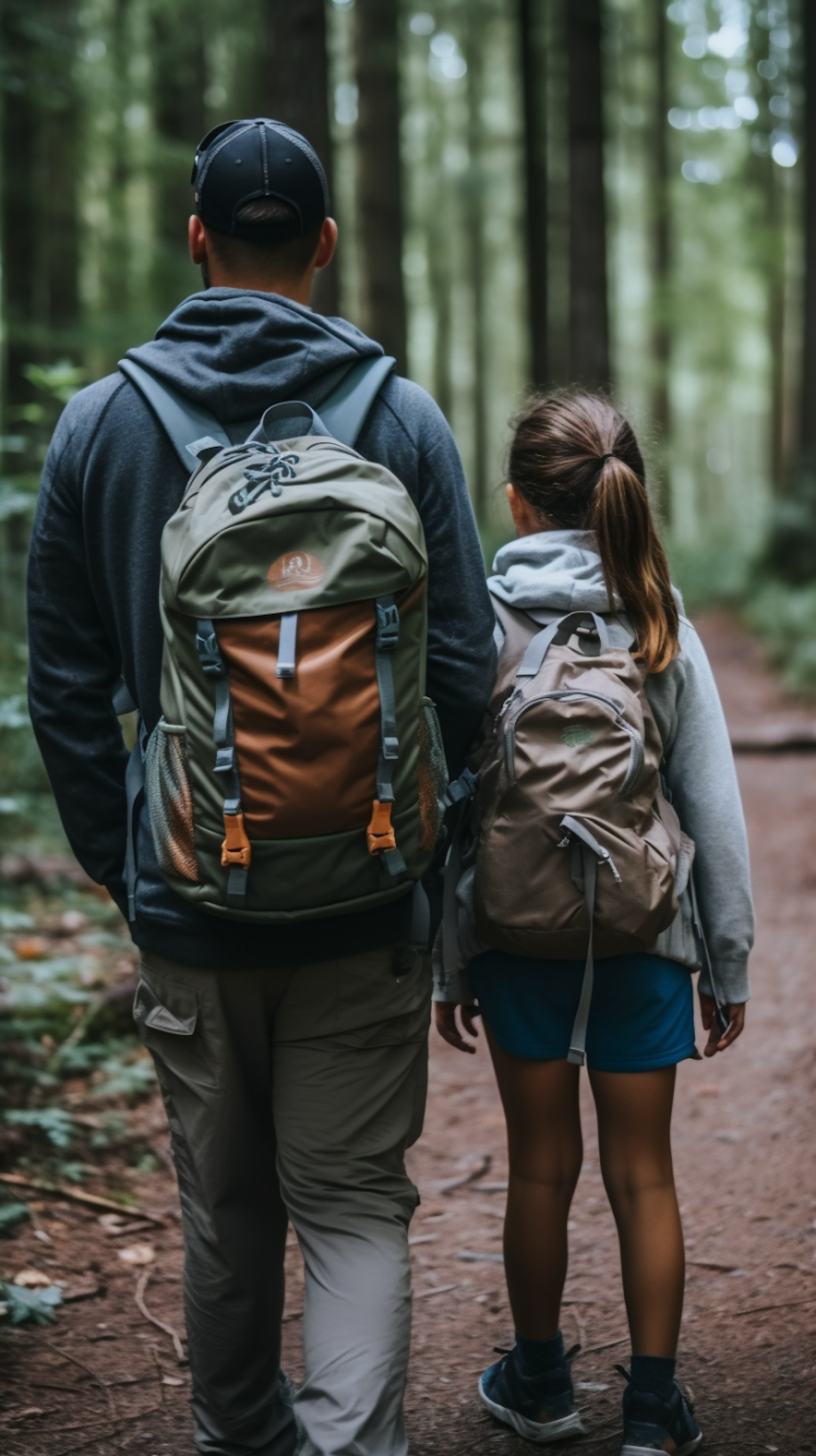 Father and daughter hiking through a lush forest, carrying backpacks. Serene nature walk on a dirt trail surrounded by tall trees.