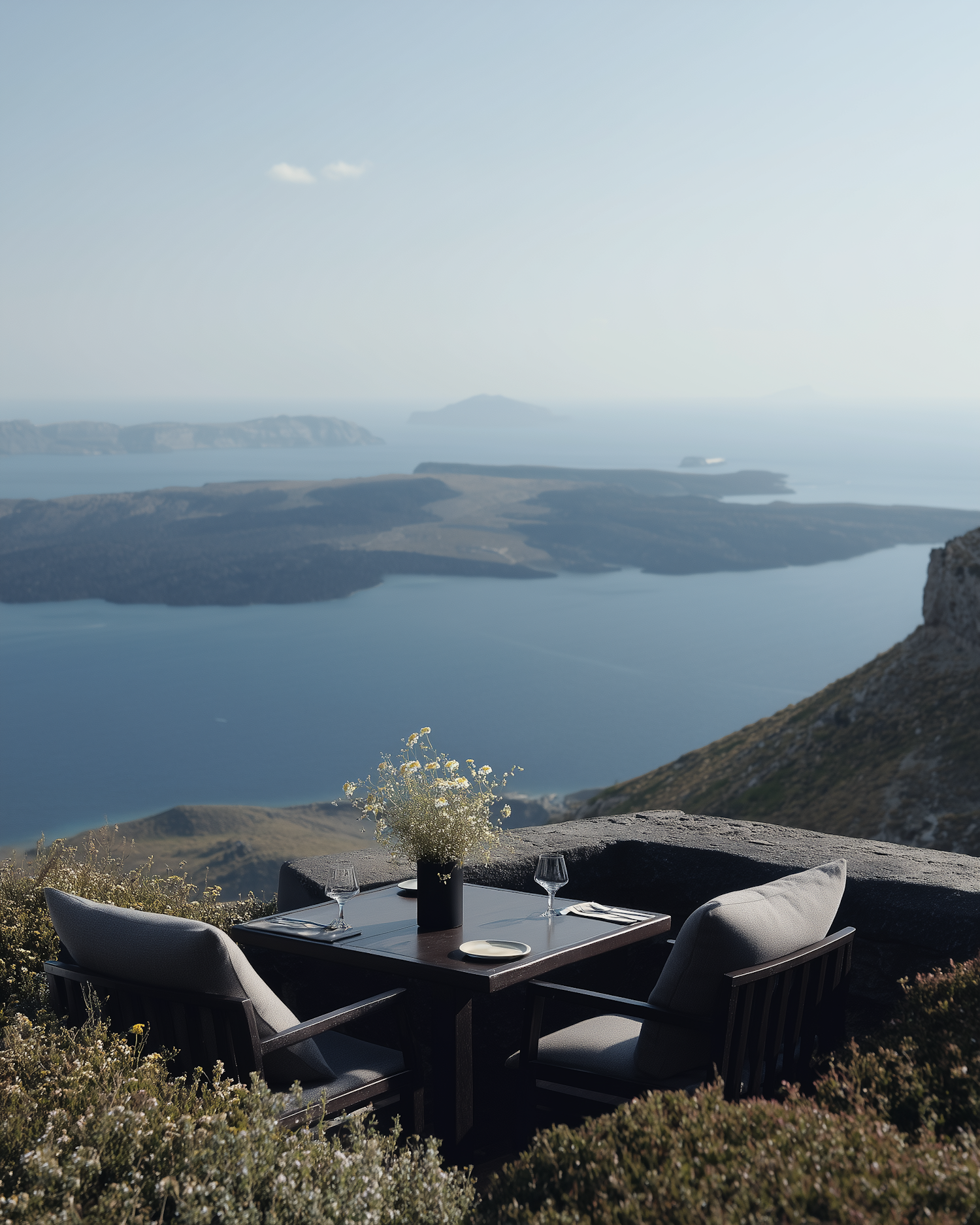 Romantic outdoor dining setup overlooking a stunning ocean view with islands, featuring elegant tableware and a floral centerpiece.