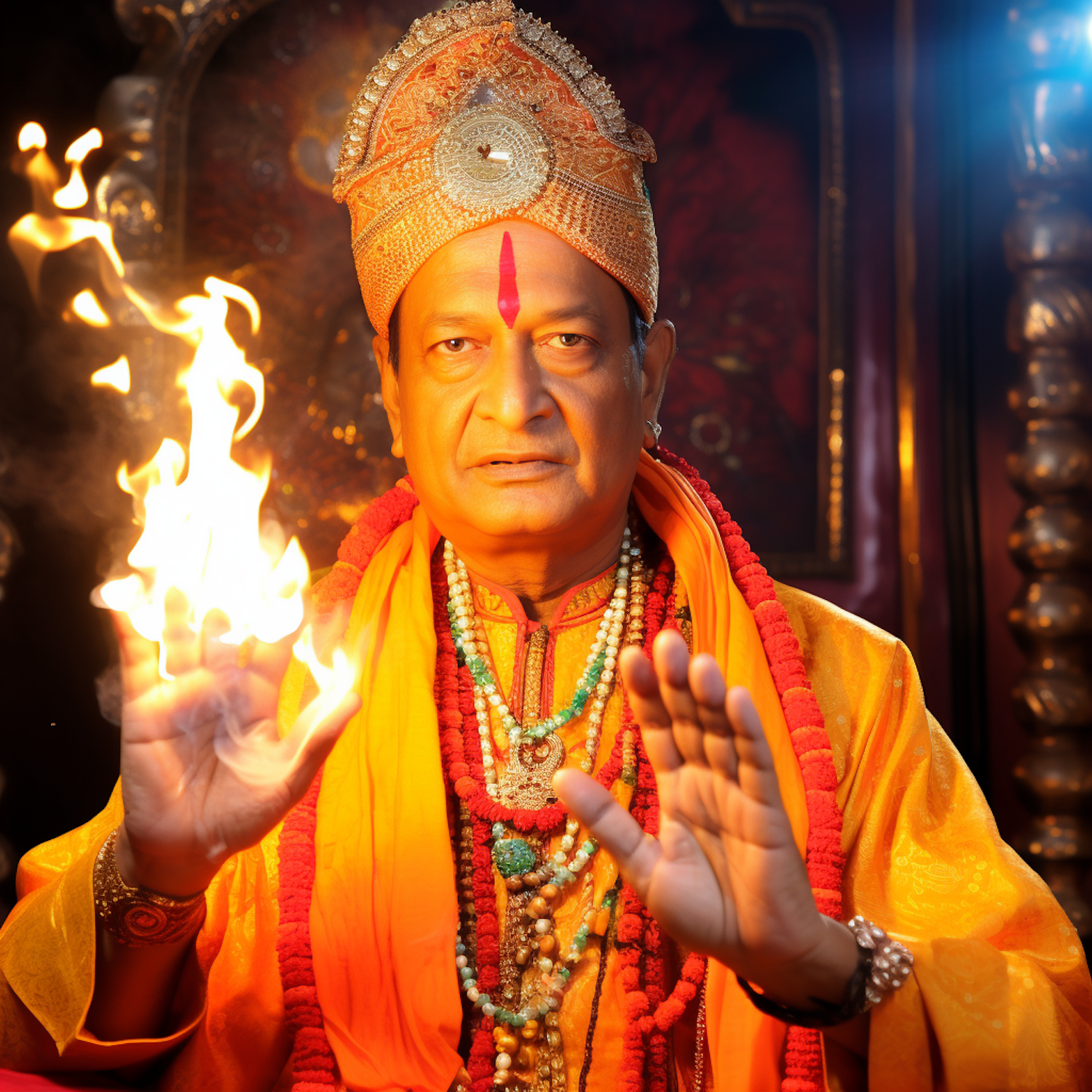 A man in ornate traditional attire conjures a flame in his hand, creating a mystical and dramatic visual effect.