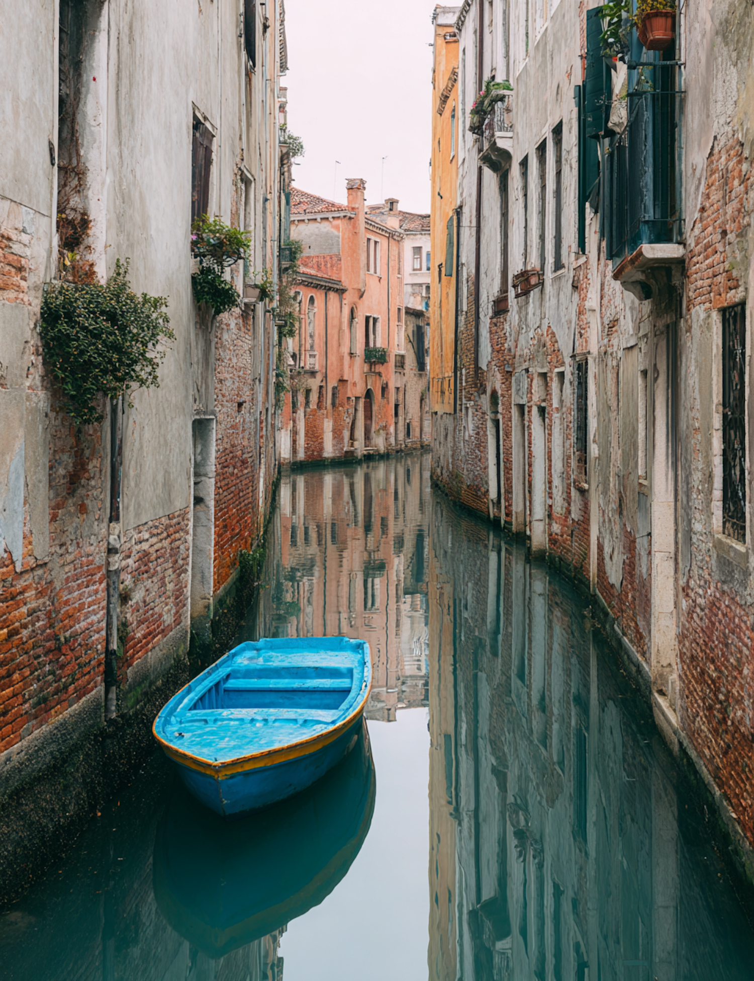 A peaceful canal with a blue boat surrounded by historic, weathered buildings and their reflections in the water.