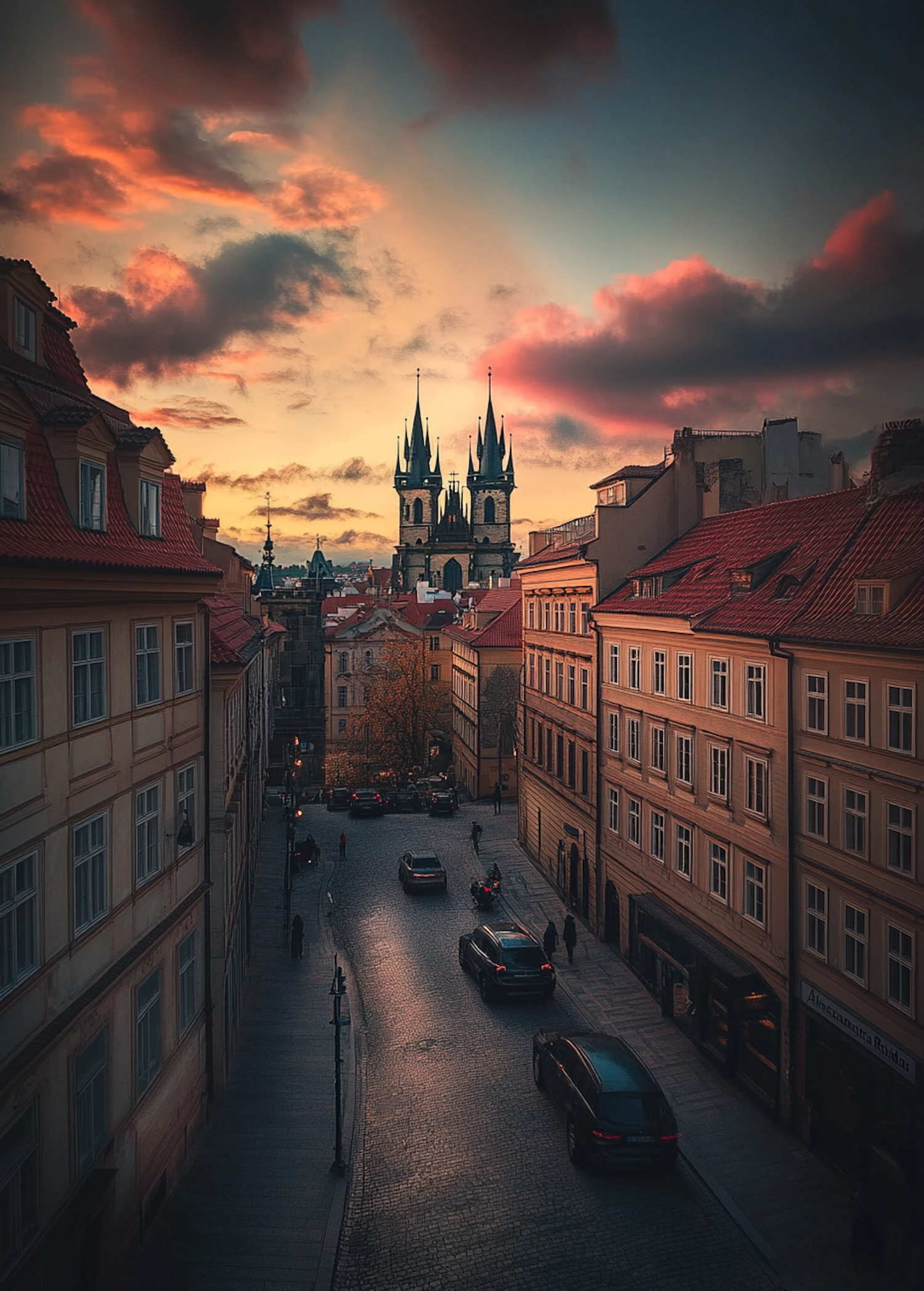 Charming European street at dusk with cobblestone roads, historic buildings, and a stunning Gothic church under a vibrant sunset sky.