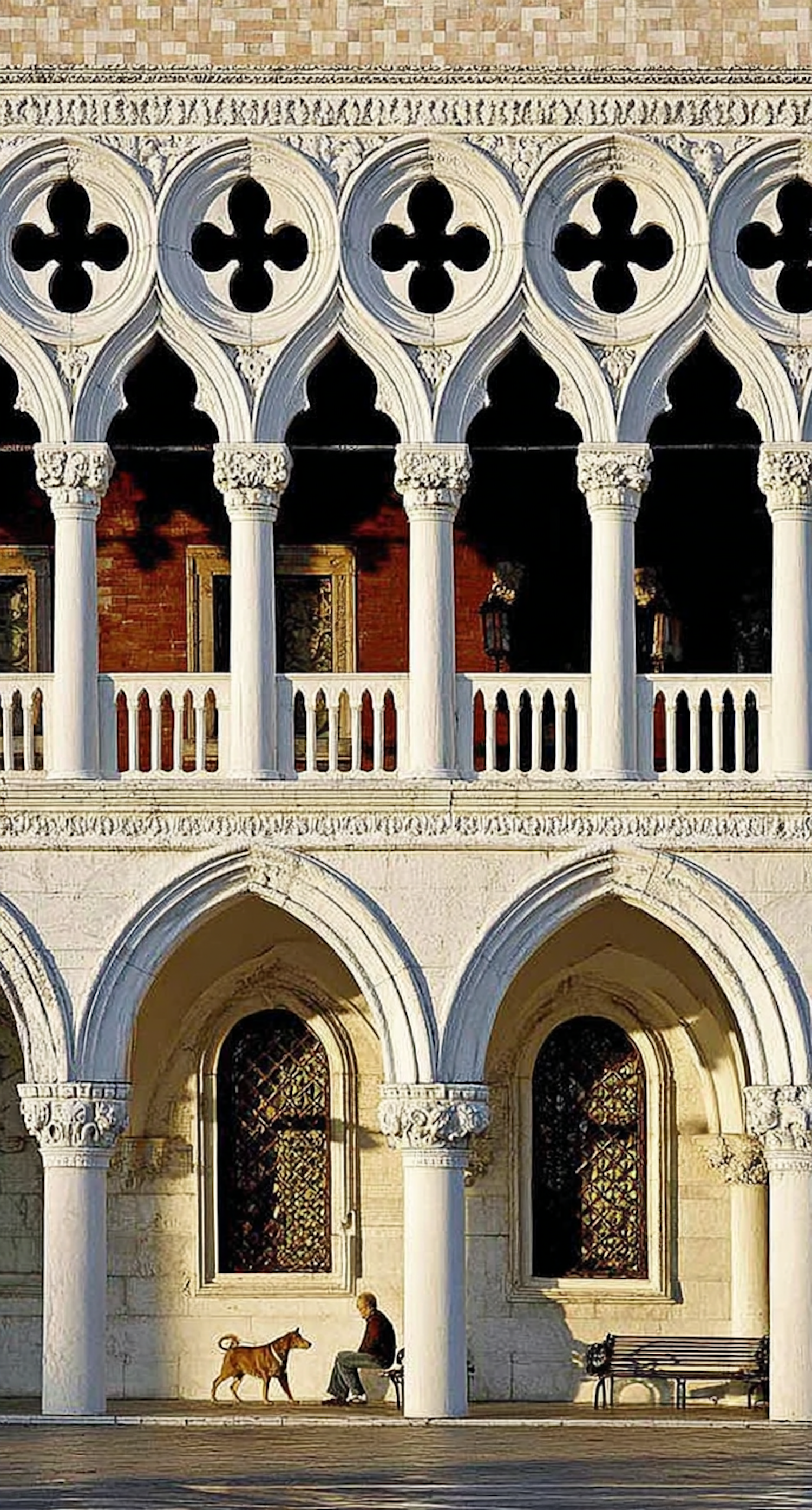 Elegant arches and columns of a historic building, with a person and dog in a serene moment under the warm sunlight.