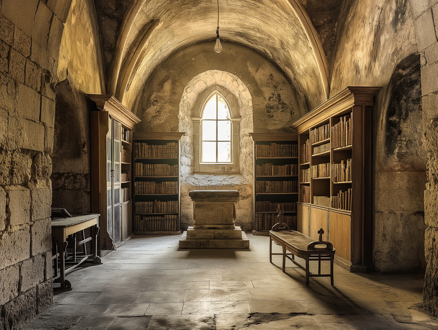 Ancient library room with stone walls, vaulted ceiling, and wooden bookshelves filled with old books. A serene, historical atmosphere.