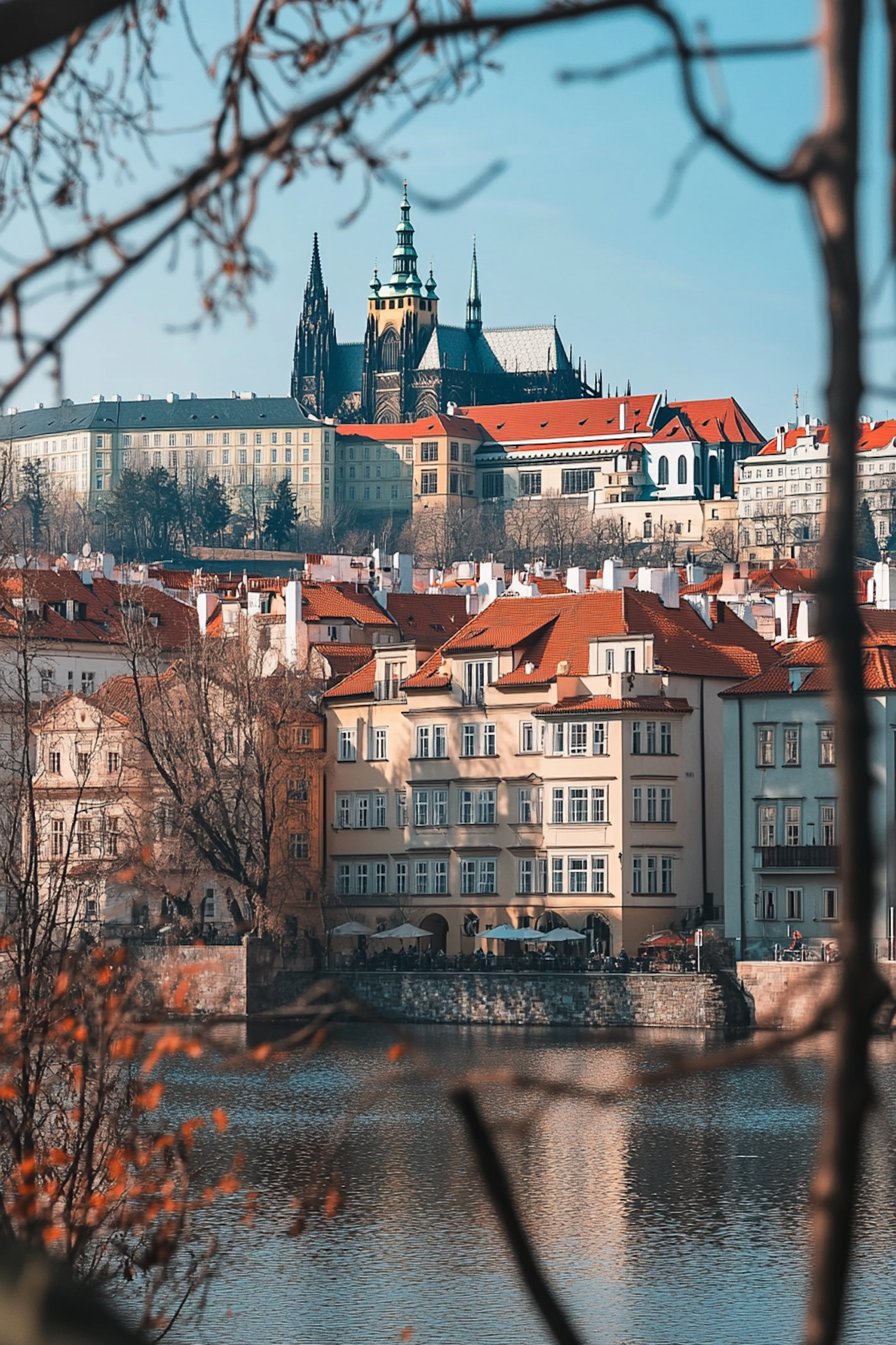 Stunning view of a historic European city with a Gothic cathedral, red-tiled roofs, and a serene river reflecting the skyline.