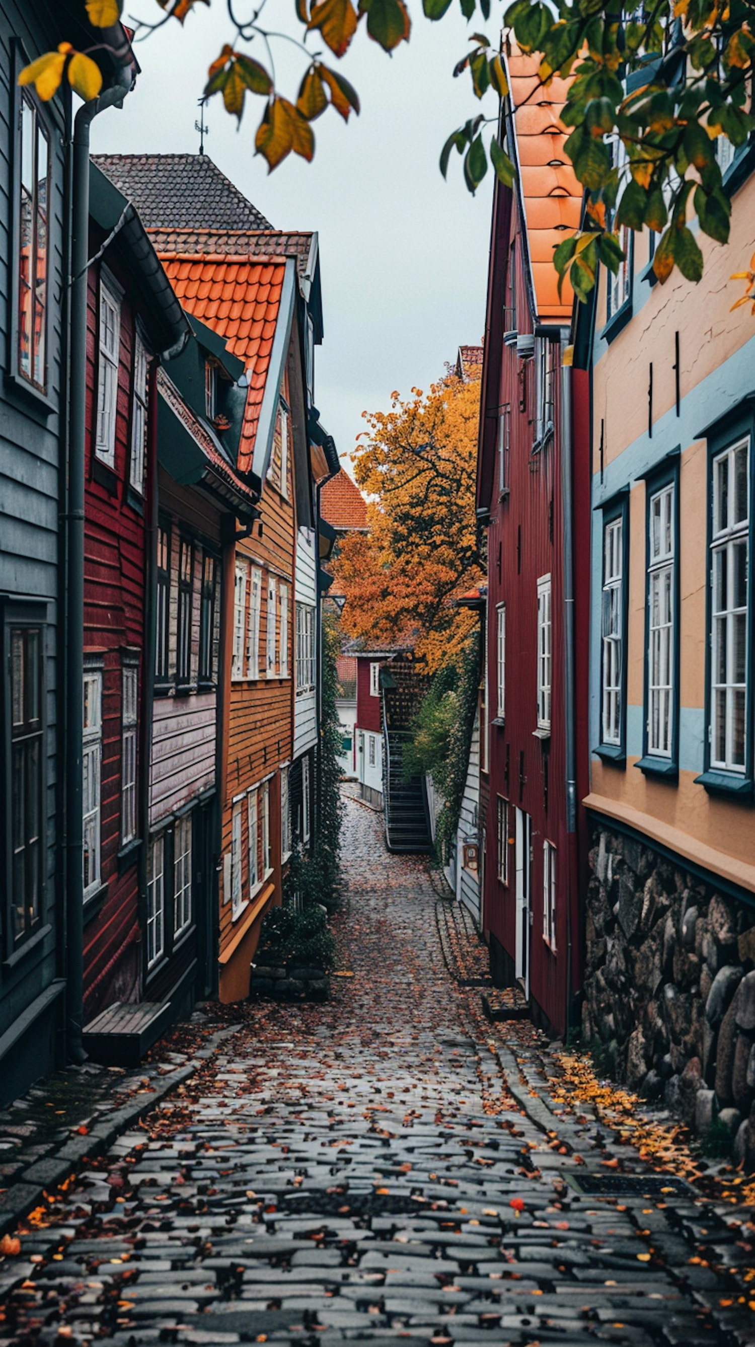 Charming cobblestone street with colorful wooden houses and autumn leaves, creating a cozy European village vibe.