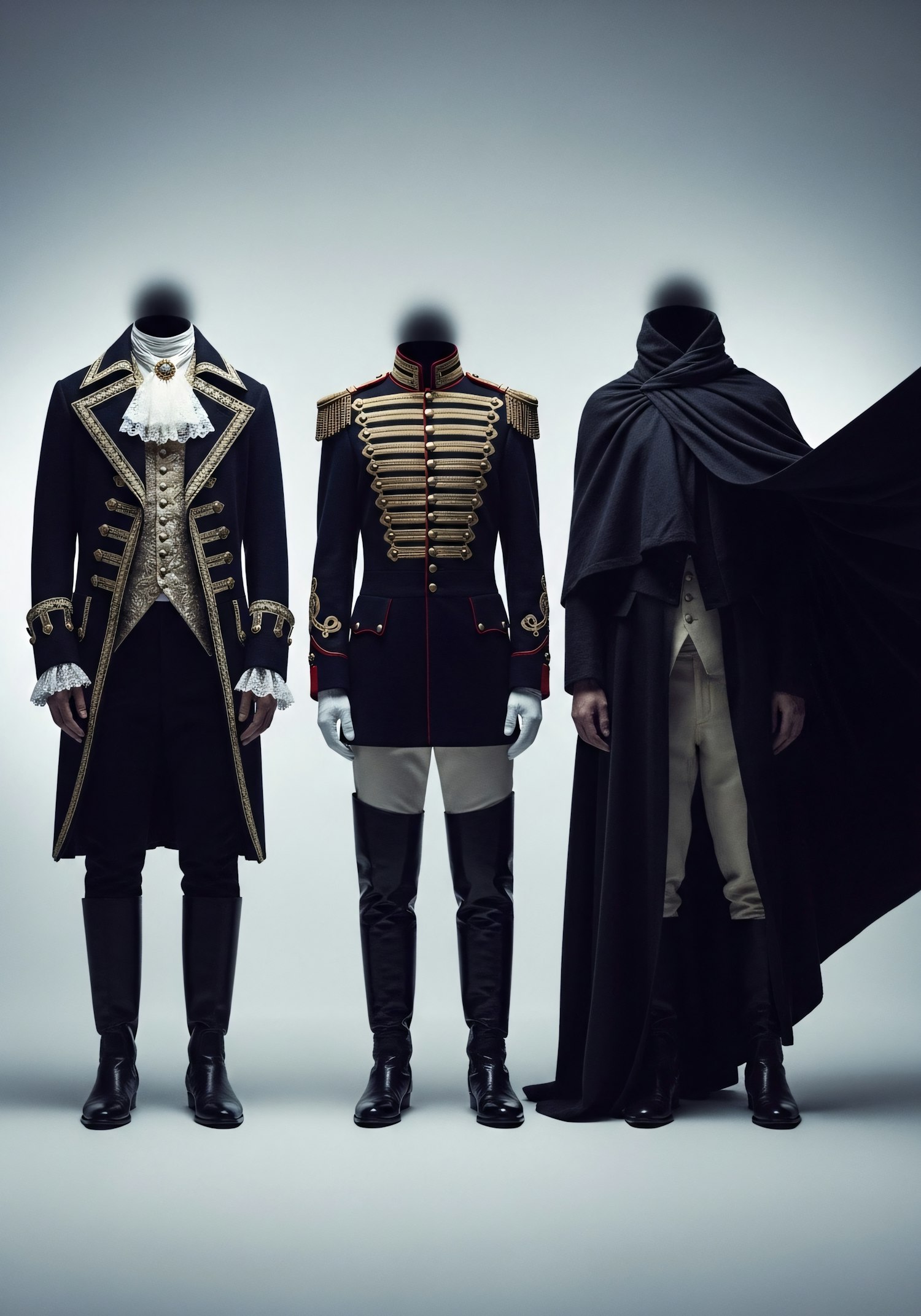Three mannequins in historical and dramatic costumes, featuring ornate designs, military-style uniforms, and a dark flowing cape.