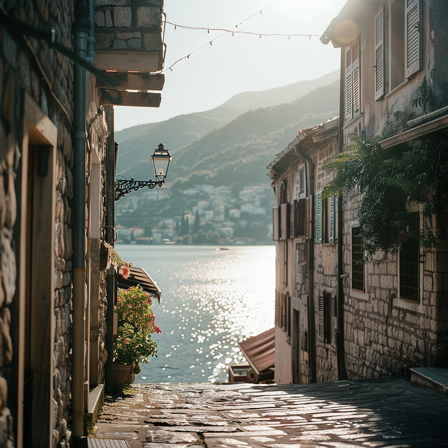 Charming cobblestone street with stone buildings, vintage lamp, and scenic water view in a tranquil coastal village setting.