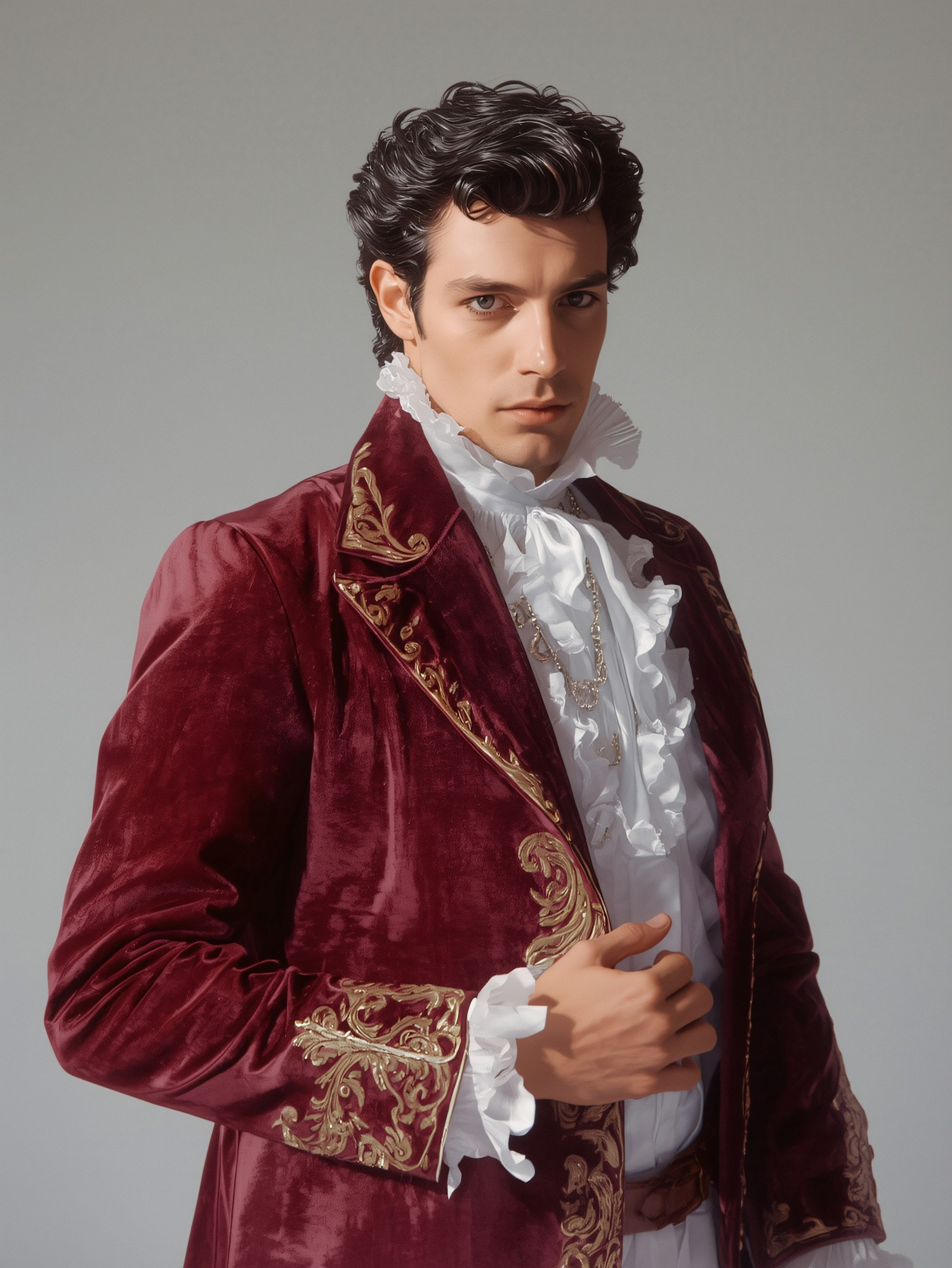 A man in a burgundy velvet coat with gold embroidery and a white ruffled shirt, styled in a historical fashion, against a neutral background.
