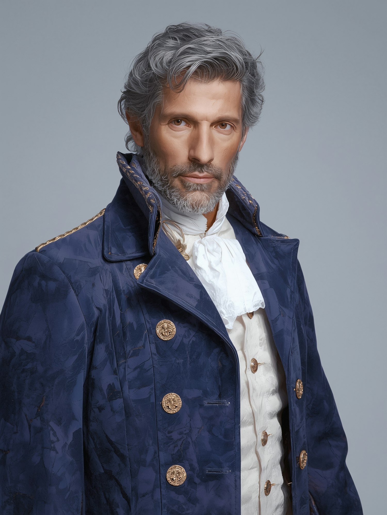 A man in a historical blue coat with gold buttons and a white cravat, exuding a classic and elegant style.