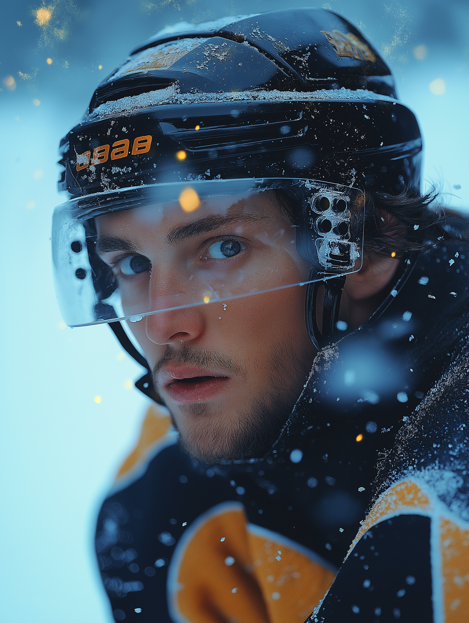 Close-up of a focused ice hockey player in a snowy setting, wearing a black helmet and jersey with yellow accents.