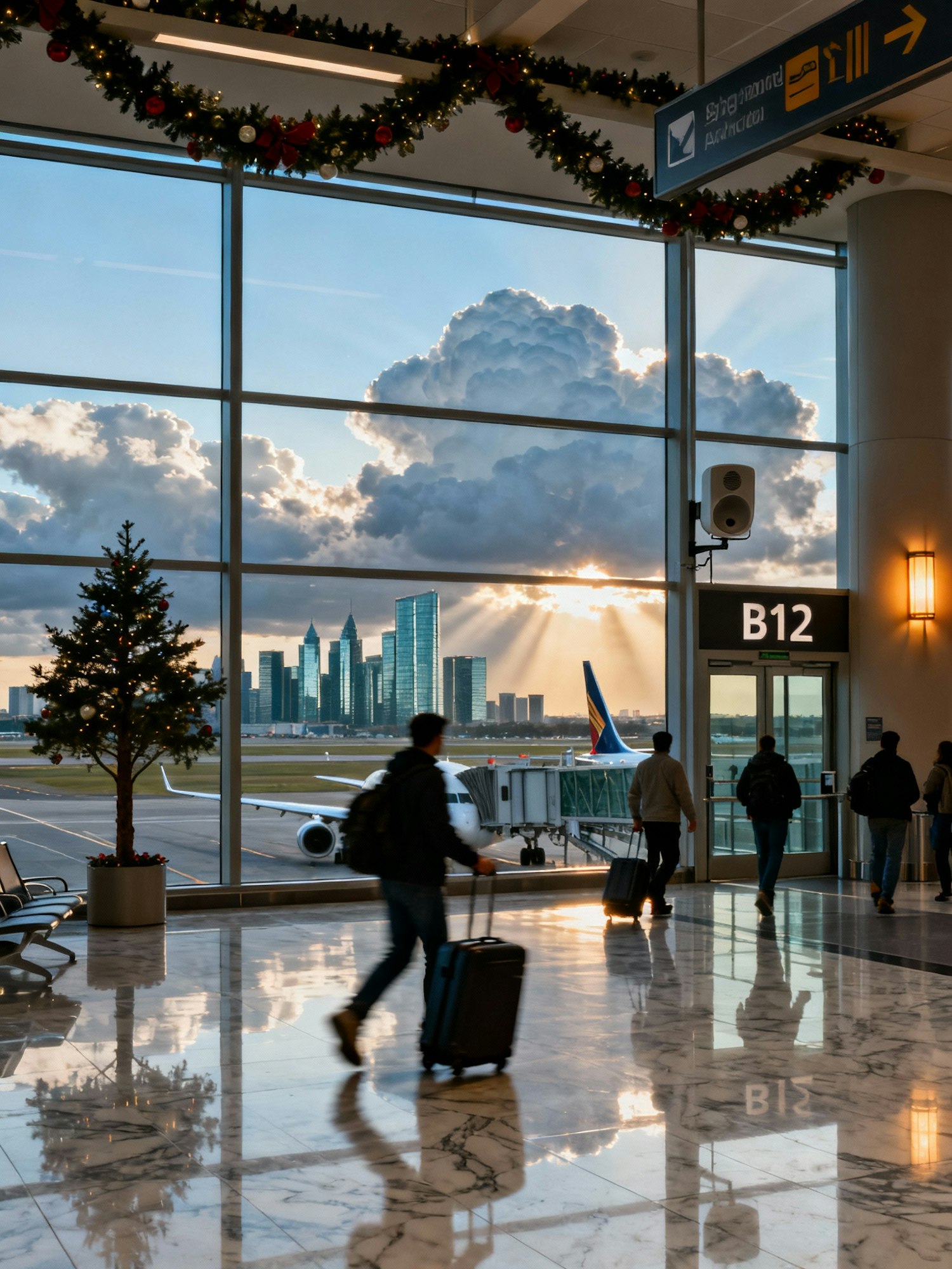 A festive airport terminal with travelers, holiday decorations, and a view of a city skyline under a dramatic cloudy sky.