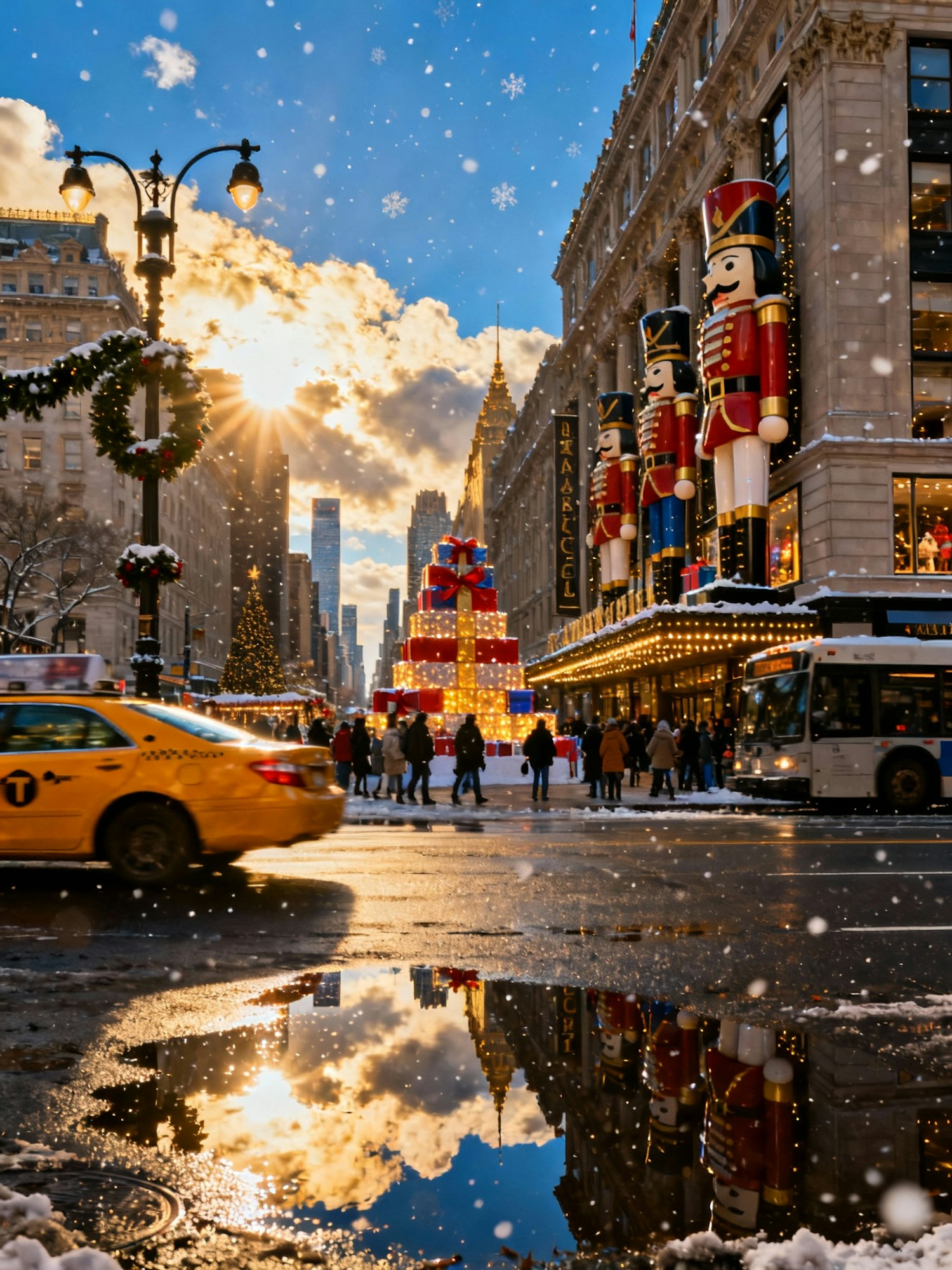Holiday avenue reveal: flagship department store windows with oversized nutcrackers and gift stacks, evergreen swags on lampposts, taxis and buses catching specular highlights on rain-dark asphalt, puddle reflections of the skyline; sun burst punches through parting cumulus and paints gold across the façades; faint snow in the air. 24 mm, f/7.1, ISO 100, 1/250 s; circular polarizer to deepen sky but avoid rainbow banding. Negative: gray haze left uncorrected, over-clarity, halo edges.