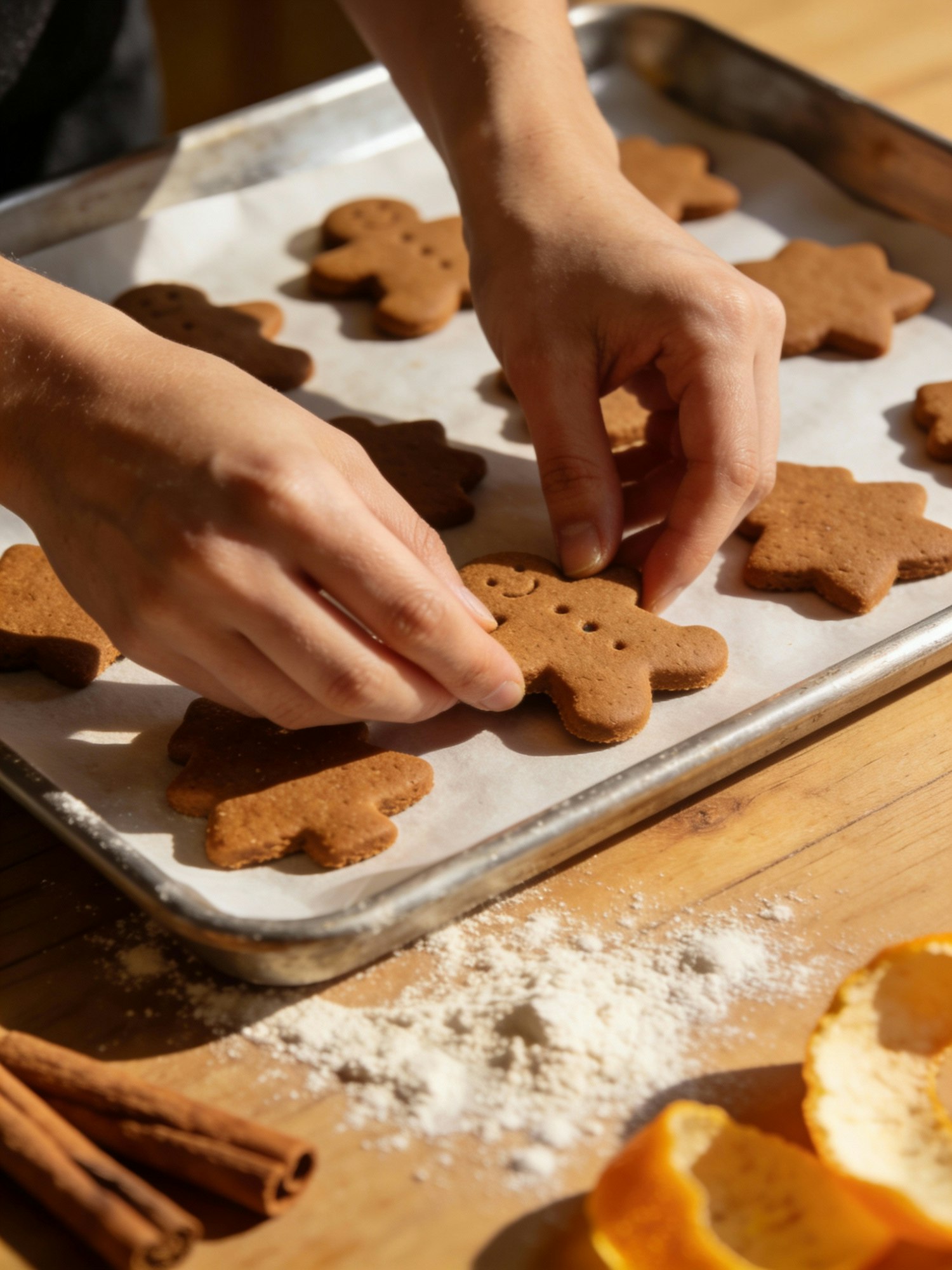 Hands arranging gingerbread cookies on a tray, surrounded by cinnamon sticks, flour, and orange peels, evoking a cozy holiday baking scene.