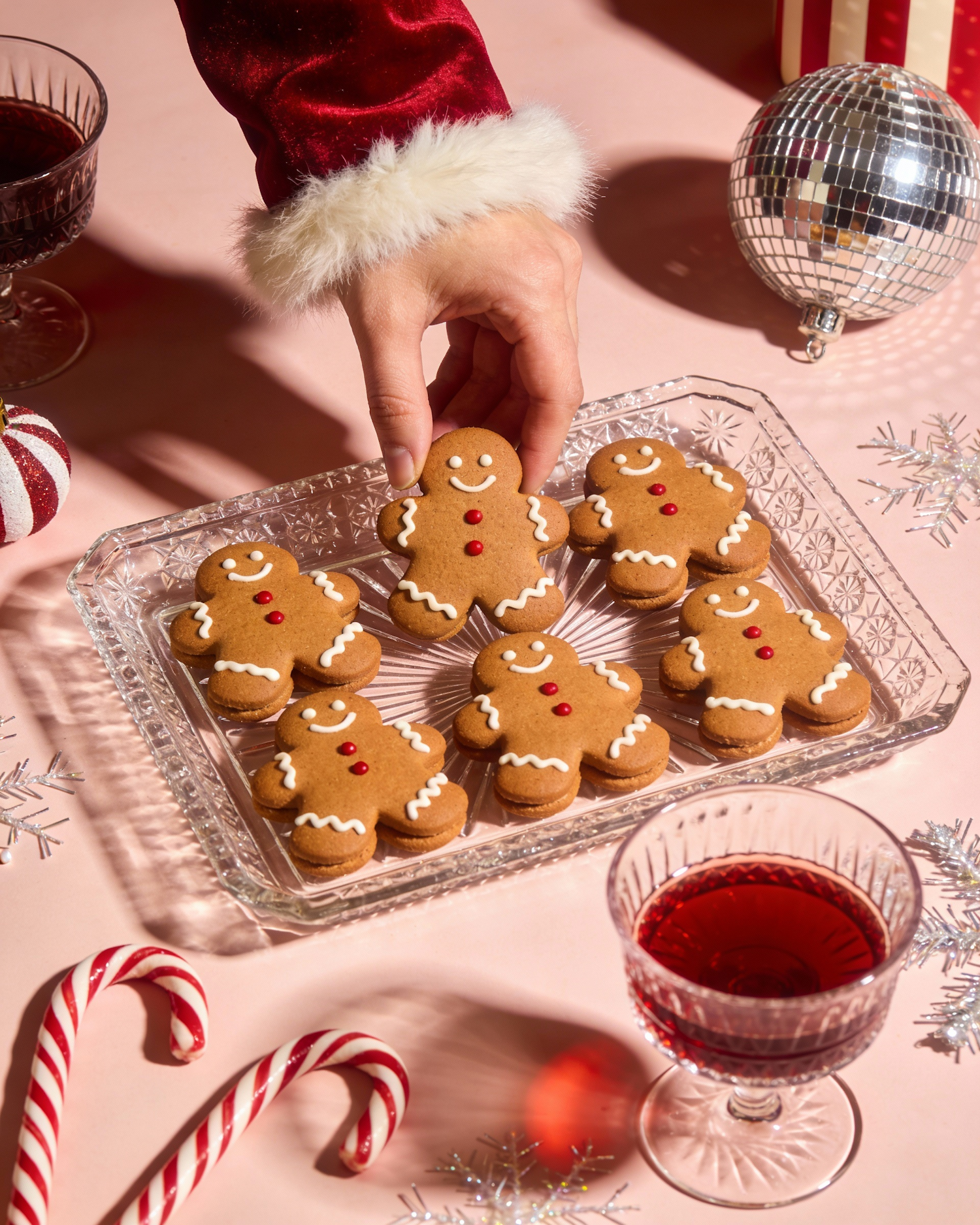 A festive editorial table scene shot from a slightly top-down angle. A glass tray filled with gingerbread men cookies replaces the cupcakes, each gingerbread figure carefully decorated with minimal white icing details and small red accents. A hand enters the frame from the top, wearing a red velvet sleeve with soft white fur trim, delicately holding one gingerbread cookie. The hand feels elegant and natural, not staged. Surrounding the tray are festive elements: candy canes, vintage glassware filled with a red holiday drink, a reflective disco ball ornament, and subtle tinsel accents. The color palette is warm and nostalgic with reds, soft pinks, browns, and touches of cream and silver. Lighting is warm, slightly low, and cinematic, creating soft shadows and highlights, like a cozy holiday evening. The scene feels indulgent, playful, and stylish, blending vintage holiday charm with a modern editorial aesthetic. High realism, rich textures, shallow depth of field