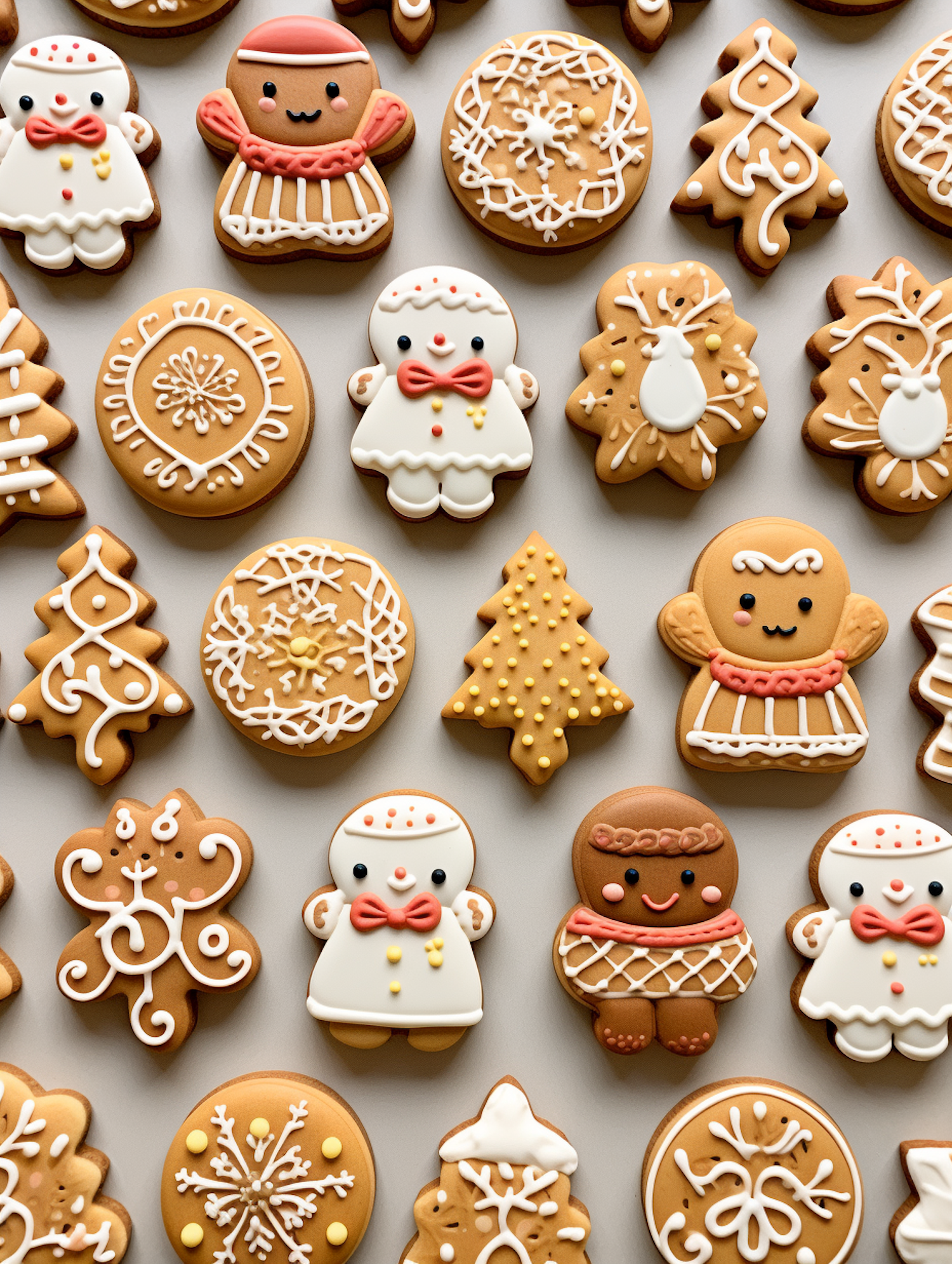 Festive gingerbread cookies with intricate icing designs, featuring gingerbread people, trees, and ornaments in warm holiday colors.