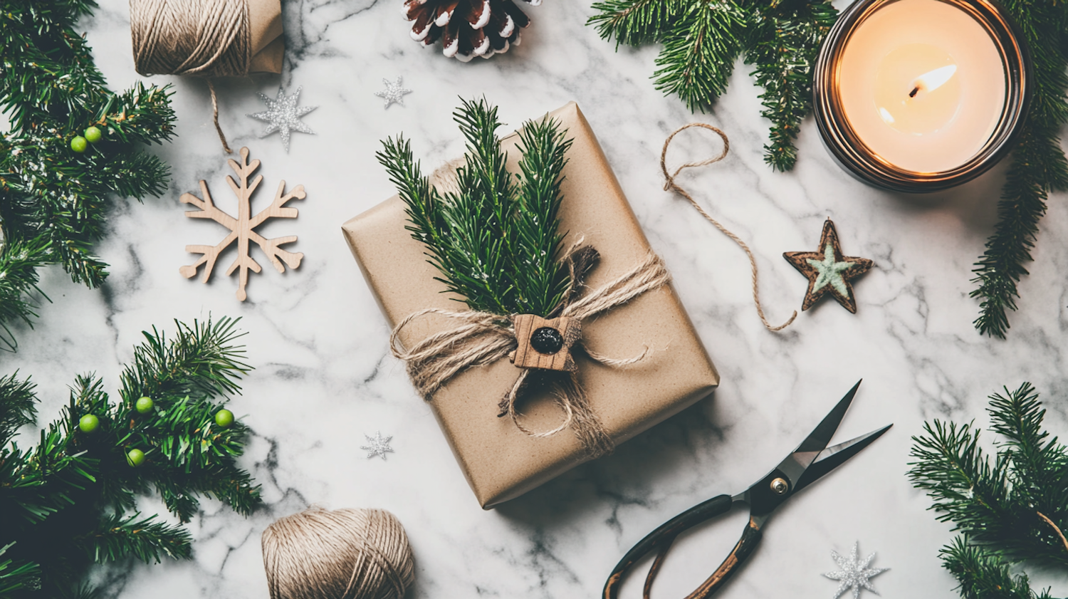 Festive holiday scene with a wrapped gift, evergreen sprigs, candle, and decorations on a marble surface.
