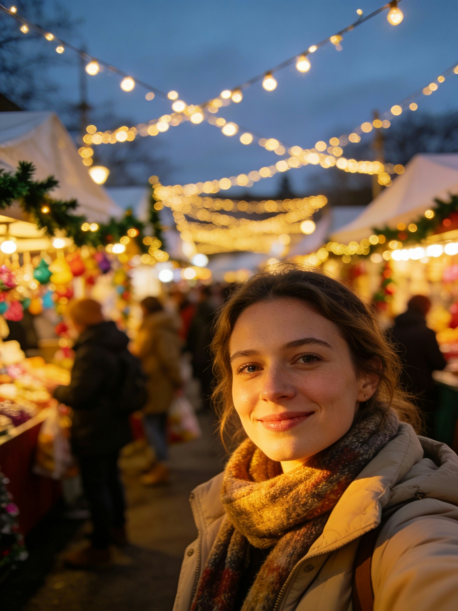 festive market selfie, woman smiling softly, string lights overhead