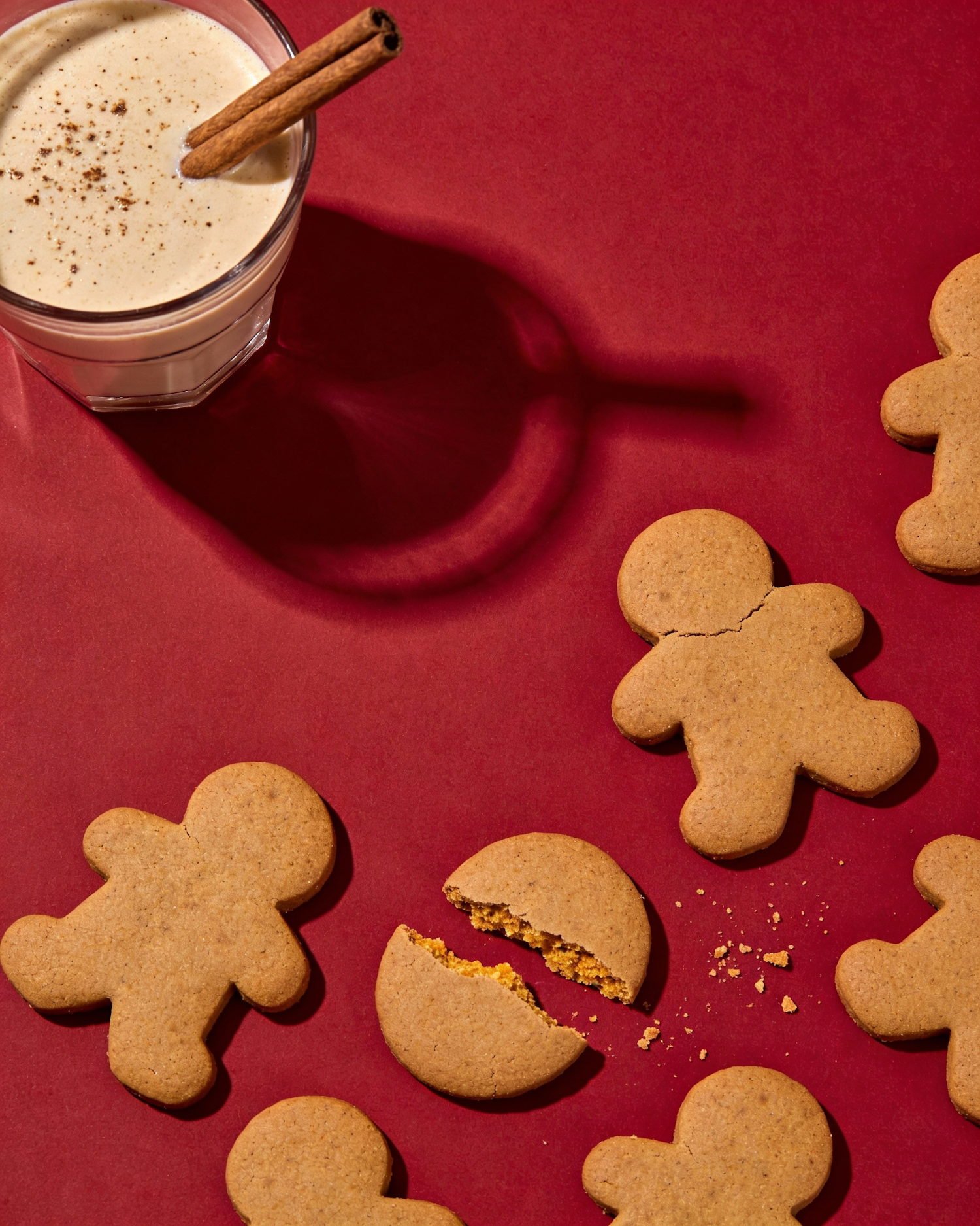 Editorial food photography, high realism, clean and graphic composition with strong negative space. The scene is shot from a strict top-down view (flat lay). The background is a smooth, matte, deep red surface, evenly colored, with a slightly velvety texture. In the upper left corner of the frame, partially cropped, sits a short glass filled with a creamy beige holiday drink (milk-based, lightly speckled with spices). A cinnamon stick emerges diagonally from the glass, pointing toward the center of the image. The glass casts a long, soft-edged shadow stretching diagonally downward toward the center-right of the frame, creating an elegant abstract shape. Scattered across the lower half and right side of the image are several gingerbread men cookies. They are medium brown, matte, with visible baked texture and slightly cracked edges. One gingerbread man near the lower center is broken in half, revealing a crumbly, golden-brown interior. The two halves are placed slightly apart, angled naturally. Small crumbs are sprinkled loosely around the cookies, especially concentrated near the bottom right quadrant, becoming more sparse toward the center to preserve open space. The central upper area of the image remains intentionally empty, creating strong negative space suitable for typography or packaging placement. Lighting is bright, directional, and slightly angled from the upper left, producing crisp highlights and defined shadows while maintaining a clean, modern editorial look. Color palette is limited and bold: deep red background, warm brown cookies, soft white, and beige drink tones. No text, no packaging, no additional props, no decorations beyond what is described. Clean, minimal, high-end food photography with a festive yet modern mood.